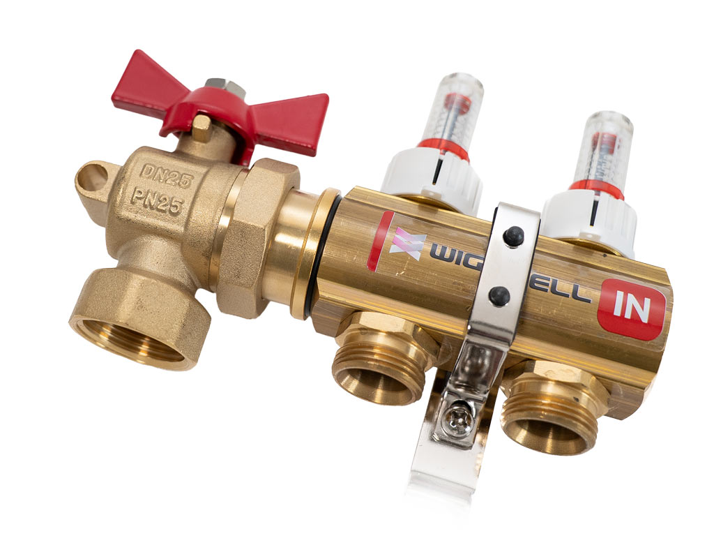 Wigell Ventil kulový rohový, se šroubením 1" a těsněním + příprava na teploměr (pár) 8481.80.90
