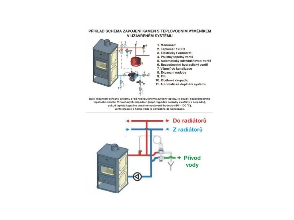 Součástí těchto krbových kamen je teplovodní výměník. Teplovodní výměník slouží k možnosti připojení topných těles nebo zásobníkového ohřívače vody. Samotný výměník se nachází kolem topeniště, konkrétně po jeho 3 svislých stranách a pokračuje vodorovně, do oblasti před odtahem spalin u výstupu z kamen. Výměník těchto kamen dosahuje jmenovitého výkonu do topné soustavy 18 kW a 6 kW do prostoru. V součtu s výkonem kamen vám pomůže vytopit prostor o objemu 350-430 m3.