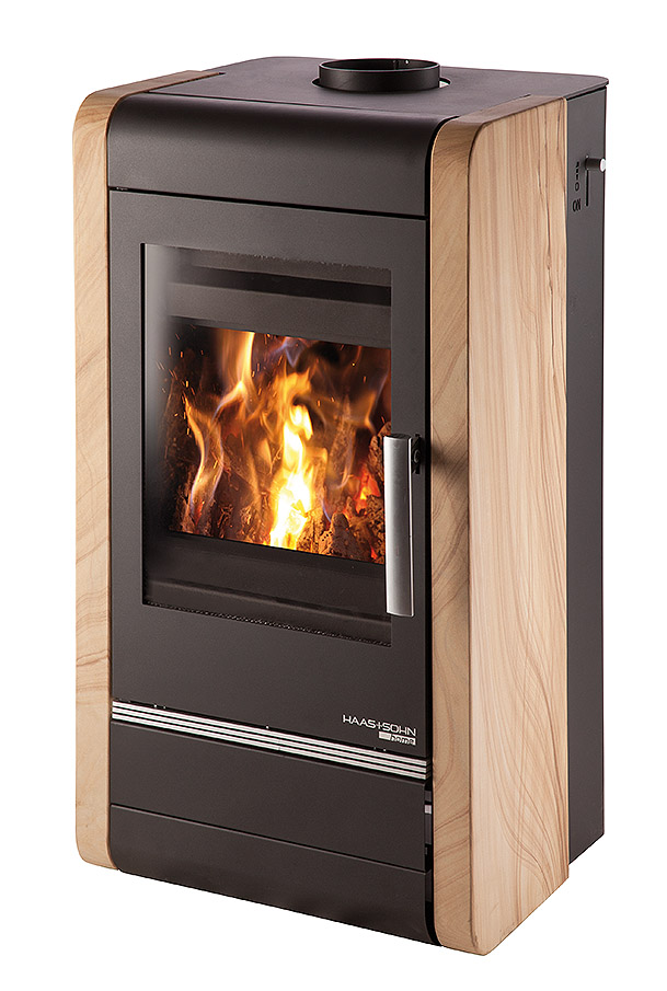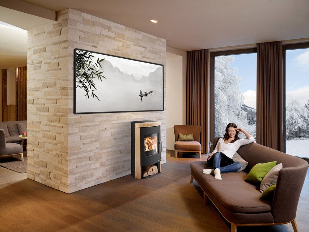 Krbová kamna Haas+Sohn AVESTA v černé barvě doplňuje obklad z přírodního kamene Woodstone Prestige. Neopakovatelná kresba přírodního pískovce děla z každých kamen jedinečný originál. Kamna spojují tradiční obdélníkový tvar a moderní design s elegantními zaoblenými hranami, který zapadne do každého interiéru.