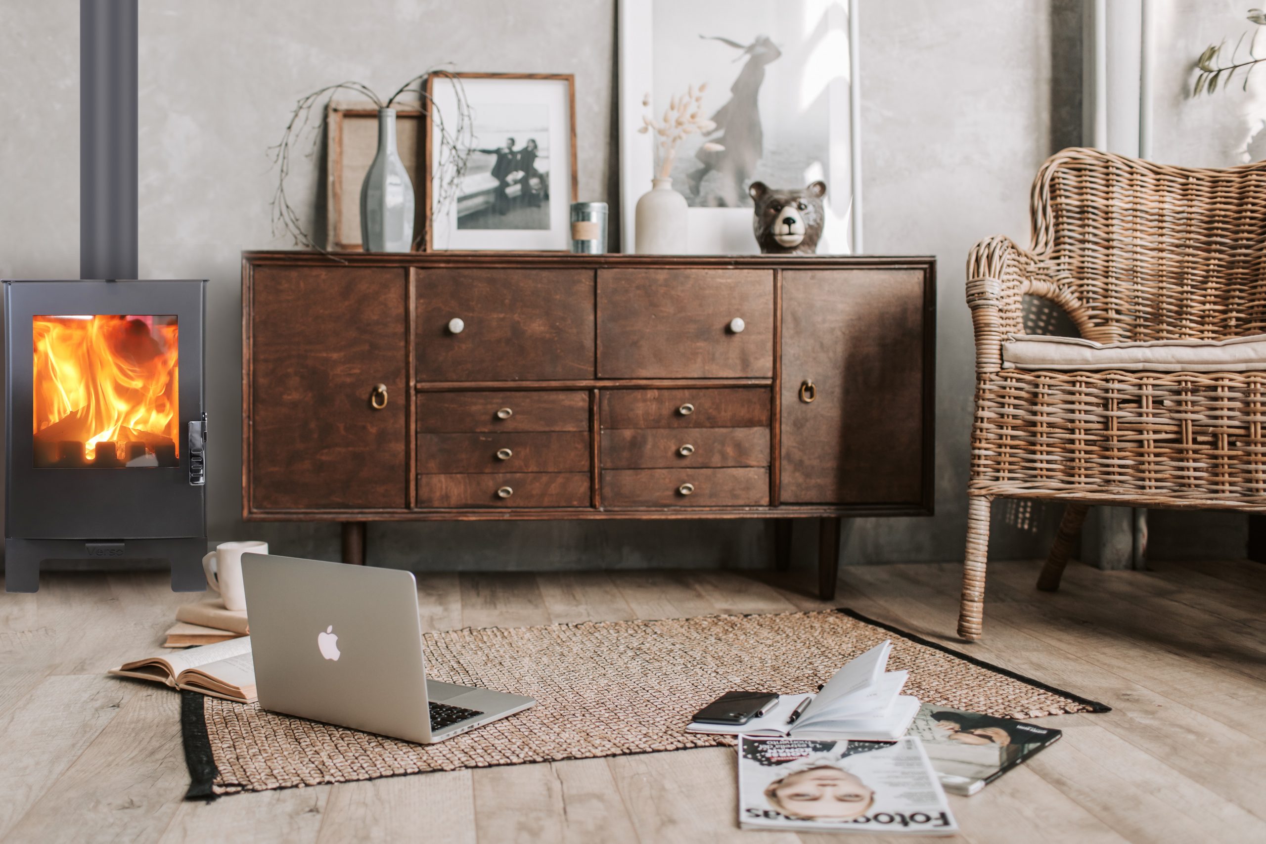 Průměr kouřovodu je 150 cm. Vývod kouřovodu je horní a na výstupu z kamen je přidána kouřová klapka pro regulaci spalin. Vnitřek topeniště je vyložen vermikulitem (univerzální nerost používaný jako vysokoteplotní izolace) a vybaven ocelovým roštem. Topný výkon lze regulovat promocí klapek pro primární a sekundární vzduch, umístěných pod dvířky. Všechna kamna Verso zajišťují ekologickou udržitelnost prostřednictvím certifikátů nejvyšší energetické účinnosti A a A+.