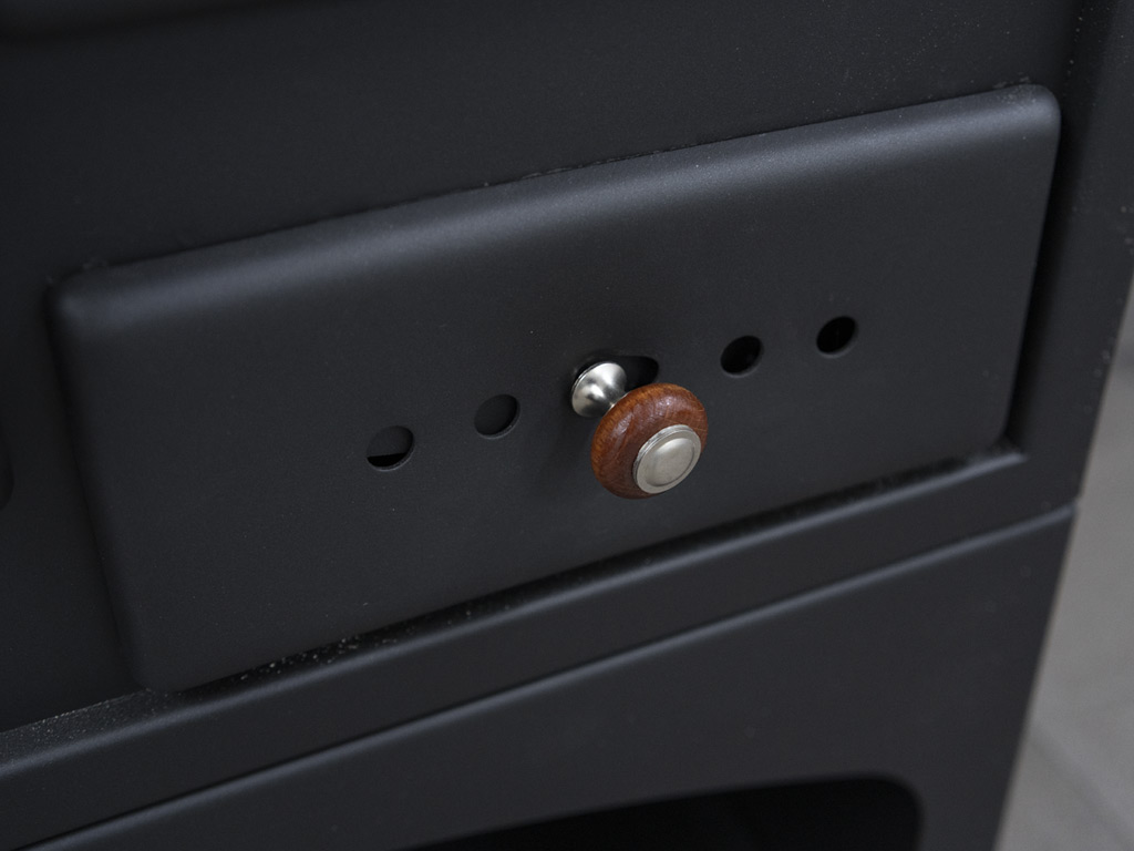 Průměr kouřovodu je 130 cm. Vývod kouřovodu je umístěn na horní desce v levém zadním rohu. Na výstupu ze sporáku je přidána kouřová klapka pro regulaci spalin. Vnitřek topeniště je vyložen šamotem o síle 30 mm a vybaven litinovým roštem. Primární vzduchovou klapkou umístěnou na dvířkách popelníku, ovládáte přívod vzduchu do kamen, sekundární vzduch oplachuje sklo a nelze ho regulovat.