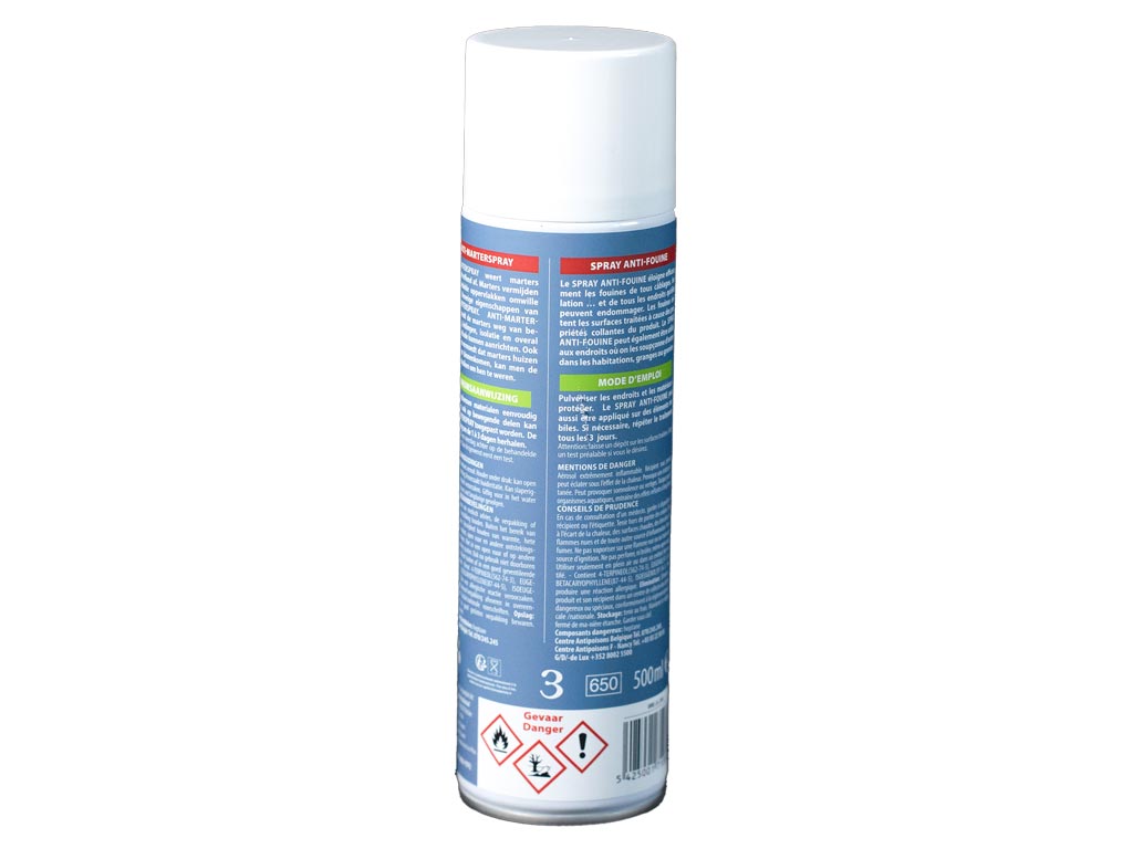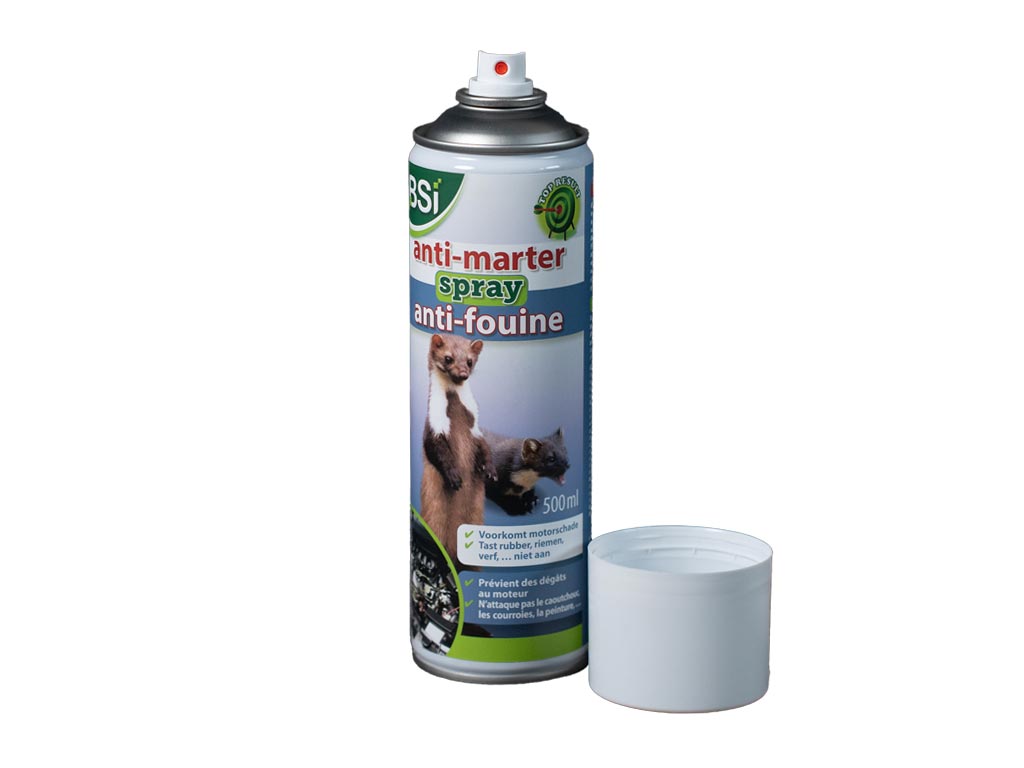 BSI Anti Marten Spray 500 ML chrání domy a vozidla před kunami. Jedná se o rychle působící sprej, který kuny odpuzuje. Přípravek použijte k ošetření míst, kde se domníváte, že by kuny mohly způsobit škody, například na izolačním materiálu, elektroinstalaci nebo potrubí. Ošetření opakujte každý jeden až tři dny, abyste kuny nadobro vyhnali.