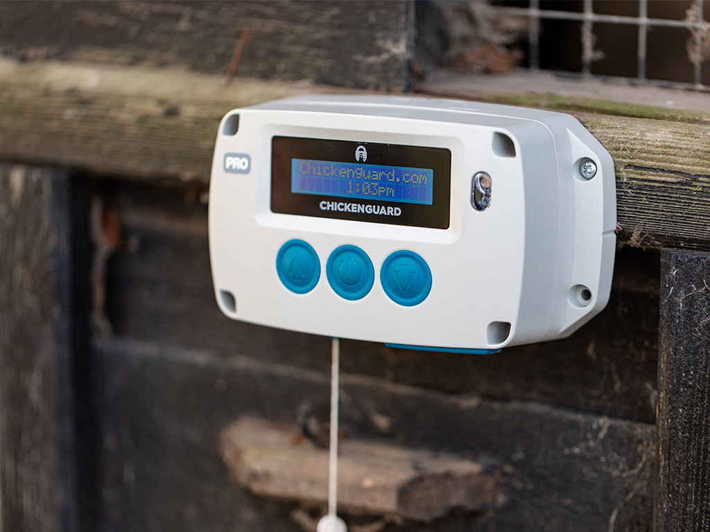 Chicken Guard Pro má velice výkonný motor, který dokáže zvednout až 2 kg, takže je ideální pro otevírání větších a těžších dvířek. Součástí zařízení je také bezkontaktní snímač polohy dvířek. Přístroj je vybaven velice odolným pouzdrem, a tak zajišťuje perfektní ochranu při extrémních povětrnostních podmínkách až do teploty -20°C. Všechny potřebné informace o nastavení jsou přehledně znázorněny na dvouřádkovém LCD displeji, v českém jazyce. LCD displej přejde po určité době nečinnosti do "režimu spánku", aby se zvýšila životnost displeje. Zařízení znovu "probudíte" stisknutím tlačítka MENU. Pro nastavování programů slouží extra velká tlačítka, aby bylo možné je ovládat i v rukavicích.
