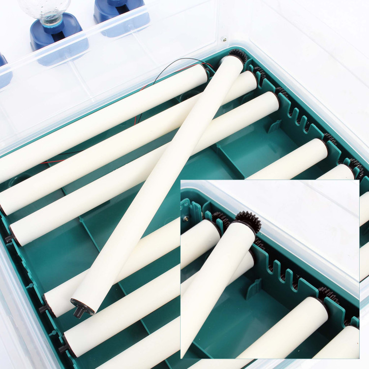 Líheň je osazena unikátním systémem otáčení vajec. Otáčecí mechanismus obsahuje 10 válečků, které můžete rozmístit podle velikosti vajec. Díky možnosti zvolení rozestupů mezi vejci můžete líhnout od křepelčích až po pštrosí vejce. Kapacita se liší podle velikosti vajec.