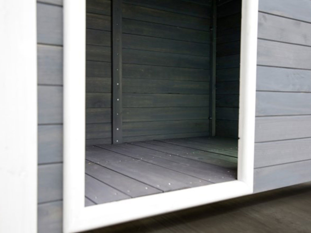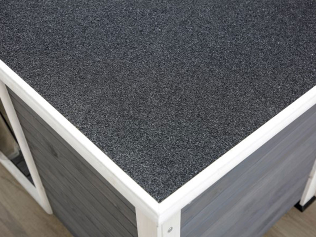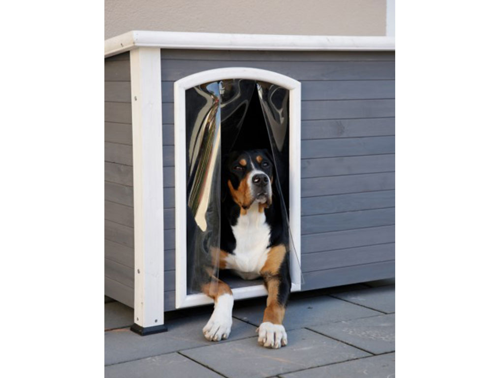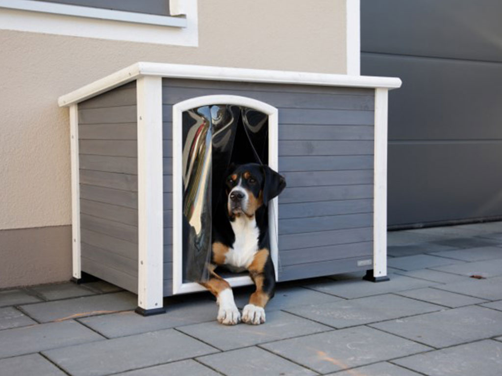Dřevěná bouda pro psa, z lakovaného dřeva, bitumenová střecha, lamelový závěs na vchodu, plastové ochranné nohy, barva šedo-bíla, rozměry 113x77x81 cm.