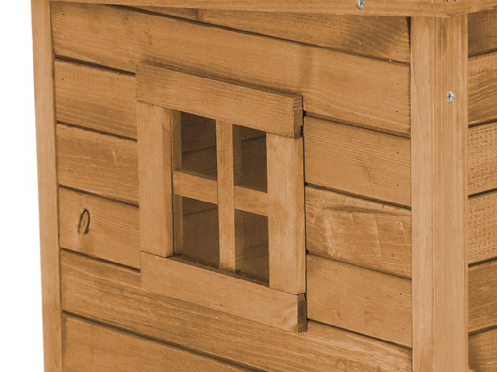 Domeček pro kočky je vybaven malým okénkem vyplněným plexisklem, pro zajištění více světla v interiéru. Dvířka jsou opatřena výklopnými průhlednými lamelami, které kočku chrání uvnitř boudy proti větru a chladu. Bouda pro kočku má čtyři výškově nastavitelné plastové nožky.