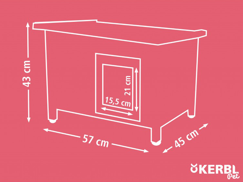 Vnější rozměry celého domečku pro kočky jsou 57 x 45 x 43 cm. Rozměry podlahy jsou 50,5 x 33,5 cm. Rozměry dvířek jsou 15,5 x 21 cm. Tloušťka stěn je 1 cm.