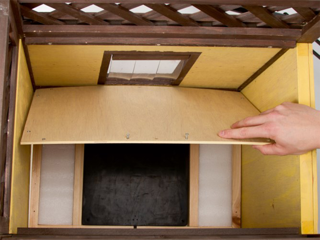 Bouda pro kočky vyrobená z dřeva je tepelně izolovaná. Izolaci zajišťují dvojité stěny vyplněné polystyrenem. Střecha domku je pokrytá ochranným nepromokavým bitumenovým materiálem. Přesto doporučujeme boudou umístit pod přístřešek, aby byla chráněná před deštěm, sněhem a slunečním zářením. Dřevěný domek je povrchově ošetřen základním ochranným nátěrem. Pro delší životnost je třeba, jako u každého dřeva, ochranný nátěr pravidelně obnovovat.