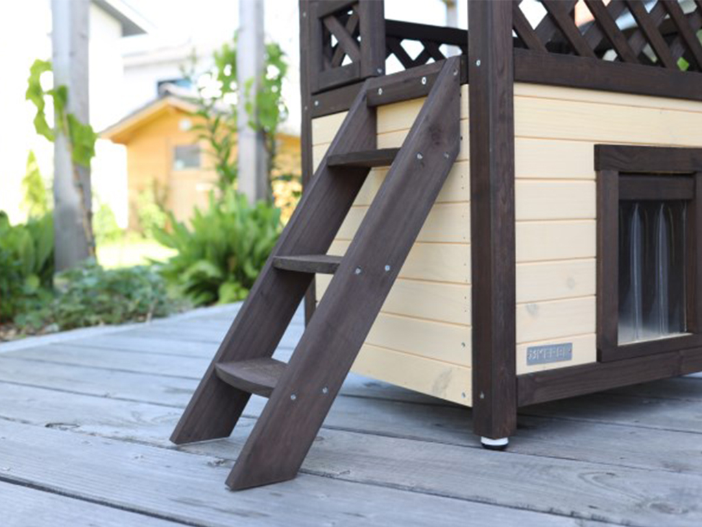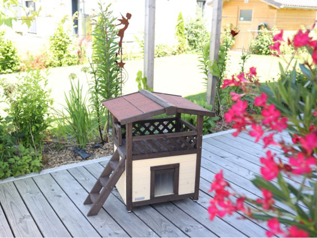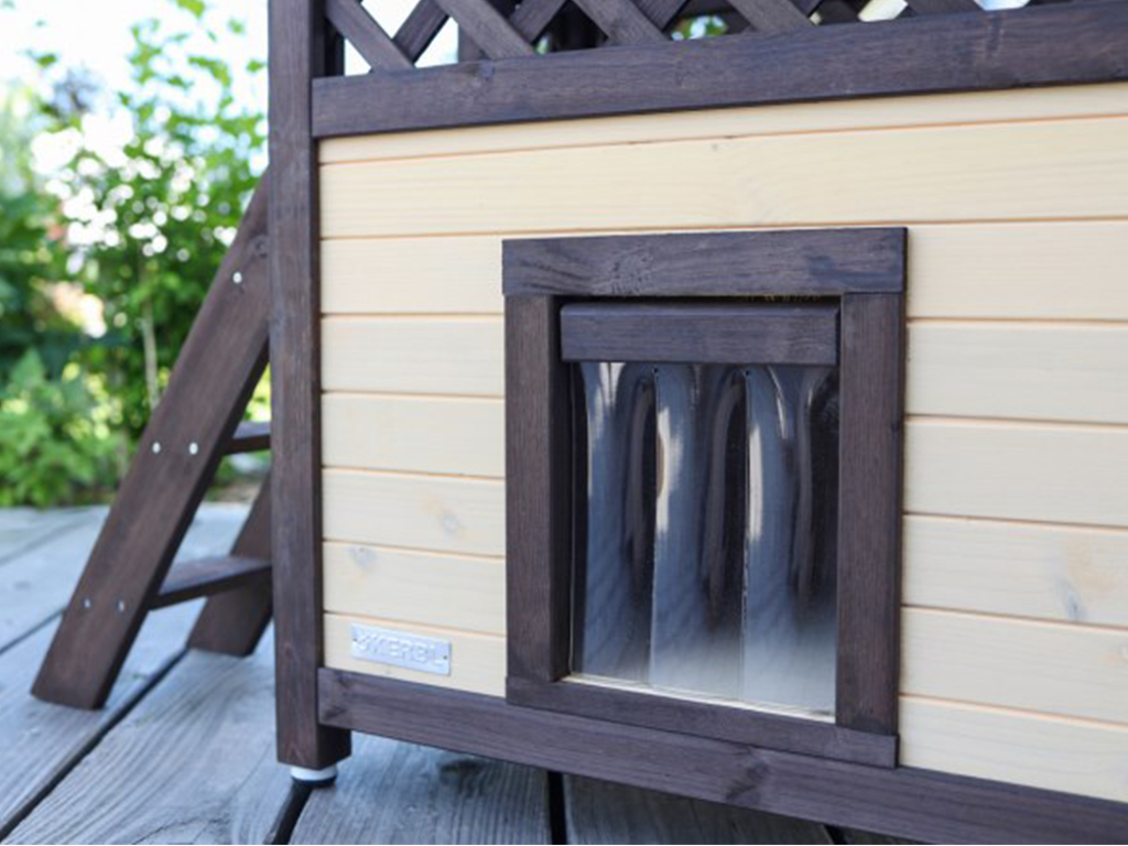 Domek pro kočky zajistí bezpečné a klidné prostředí pro vaši kočku. Nad domkem se nachází krytá terasa, na kterou mají mazlíčci snadný přístup přes dřevěné schody. Dvířka jsou opatřena průhlednými lamelami, které kočku chrání uvnitř boudy před větrem a chladem. Pod podlahou domku je připravený prostor pro topnou desku, kterou je možné dokoupit a snadno nainstalovat.
