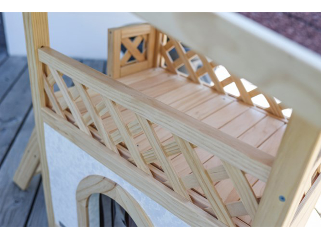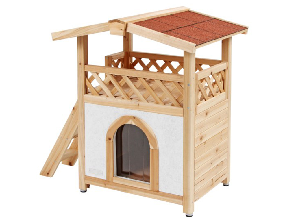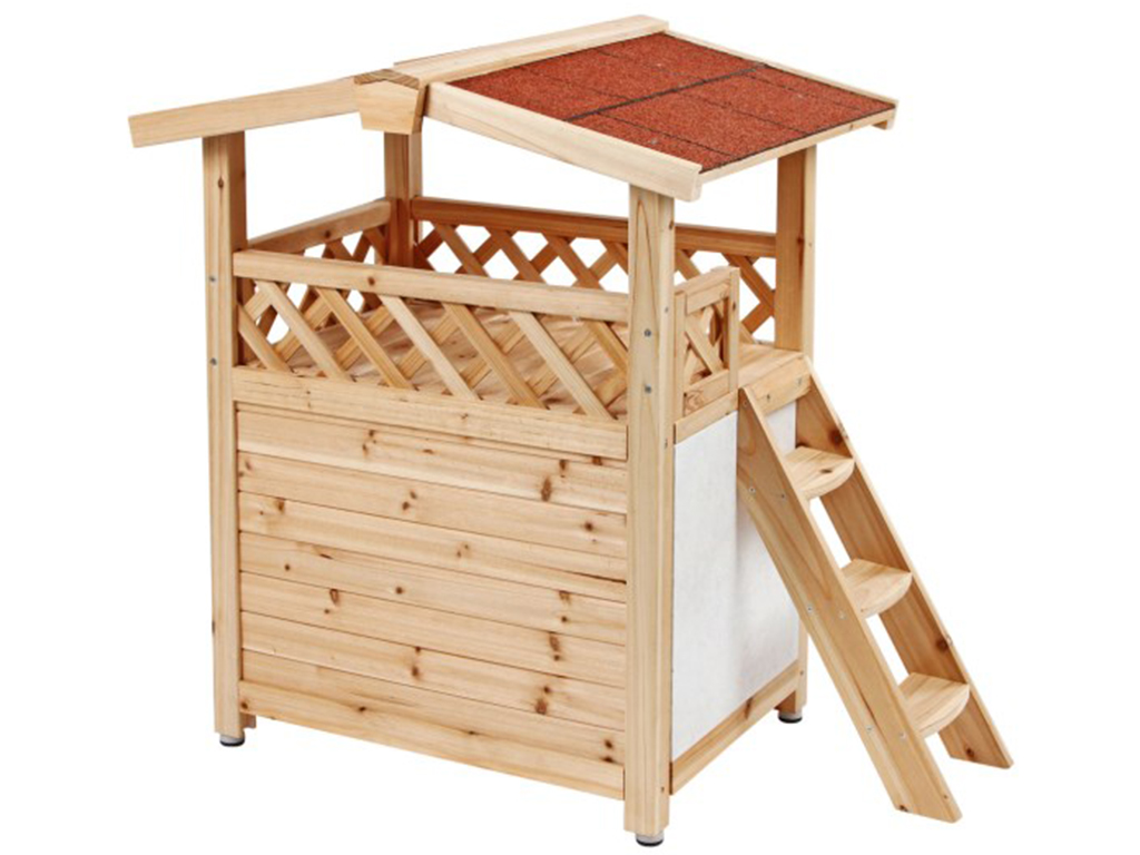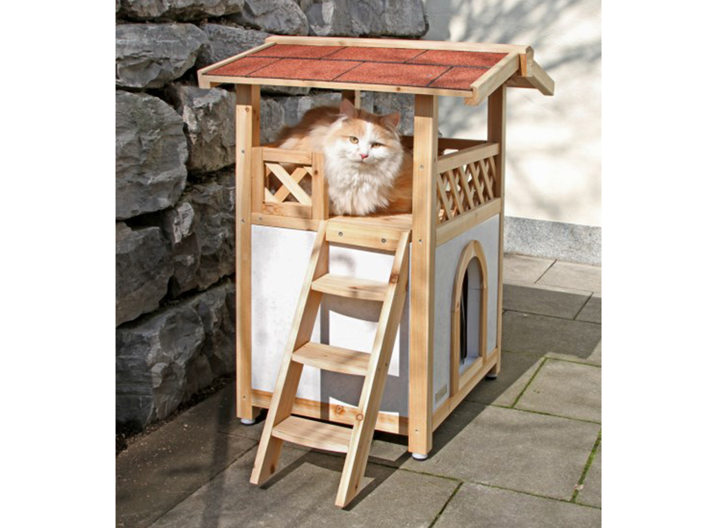 Domek pro kočky umístěný na přízemí zajistí bezpečné a klidné prostředí pro kočku. Nad domkem je umístěna krytá terasa, na kterou mají mazlíčci snadný přístup přes dřevěné schůdky. Dvířka jsou opatřena průhlednými lamelami, které kočku chrání uvnitř boudy proti větru a chladu.