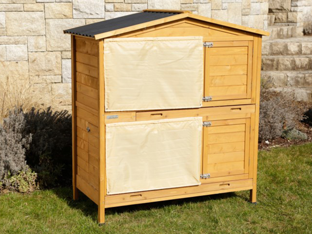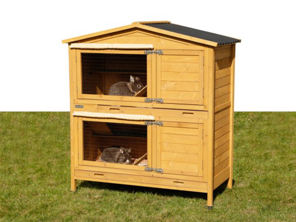 Mazlíčci budou mít v králíkárně dostatek prostoru a pohodlí. Králíci si mohou odpočinout v menší části králíkárny, která jim nabídne příjemné soukromí a stín nebo ve větší osvětlené části, která je vybavena pevnou mřížkou. Tato část s mřížkou je opatřena rolovací zástěnou pro ochranu před nepříznivými povětrnostními podmínkami. Oba patra králíkárny mohou být průchozí nebo je možné jednotlivá patra oddělit a uzavřít. Králíkárna má celkem čtyři samostatná přední dvířka, která jsou pro zvýšení bezpečnosti opatřena druhým zámkem. Králíkárna je vybavena také bočními dvířky, kterými králíkovi můžete umožnit volný vstup do výběhu (výběh není součástí balení). Králíkárna je umístěna na čtyřech plastových nastavitelných nožkách.