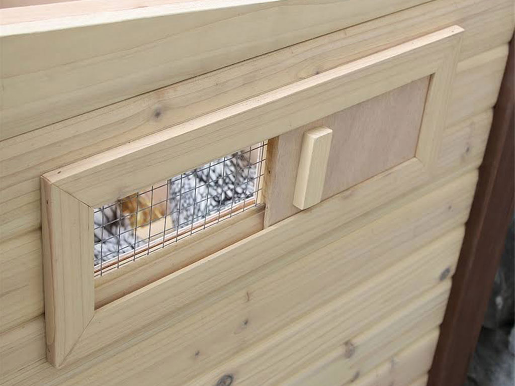 Kurník má dva vstupy. Větší vstup má výklopné dvířka, které slouží jako rampa pro snadný pohyb z a do kurníku. Dvířka obsahují dva bezpečnostní zámky proti predátorům. Menší dvířka obsahují zámek a okýnko pro prosvětlení interiéru. Na boční straně kurníku se nachází posuvné okýnko, které zajišťuje cirkulaci vzduchu.