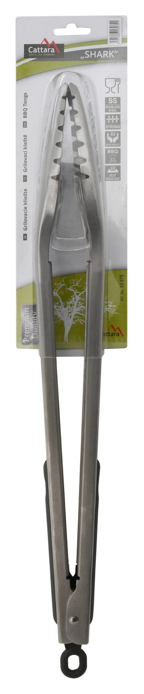 Grilovací kleště SHARK jsou prémiové kvality, jsou zhotoveny z kvalitní oceli s tloušťkou 1,8 mm. Rukojeť je z teplotně odolného materiálu a ergonomickým tvarováním v barvě žraločí šedi. Kleště jsou opatřeny otvorem pro možné zavěšení. Rozměry jsou 45 x 45 x 4,5 cm. Zadní část ze závěsným otvorem plní zároveň funkci uzamčení rozevírání kleští.