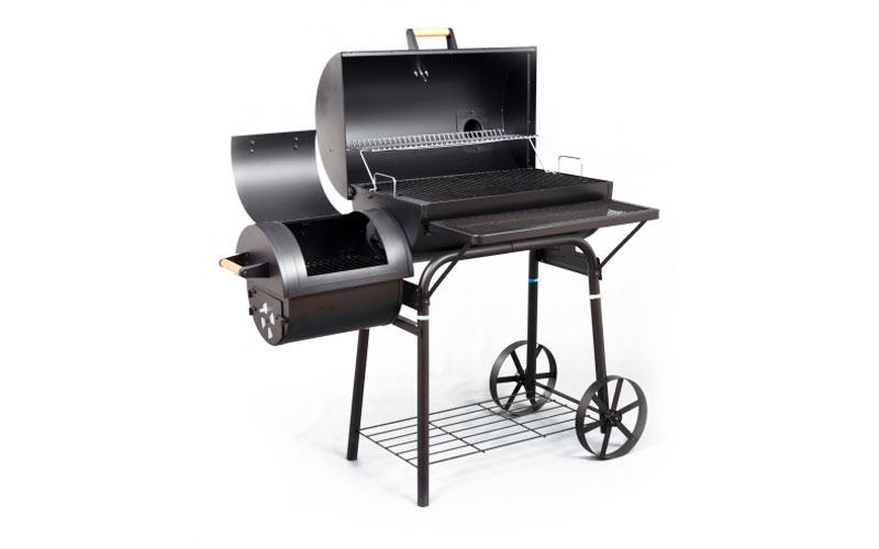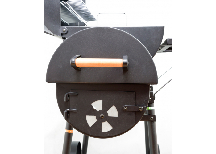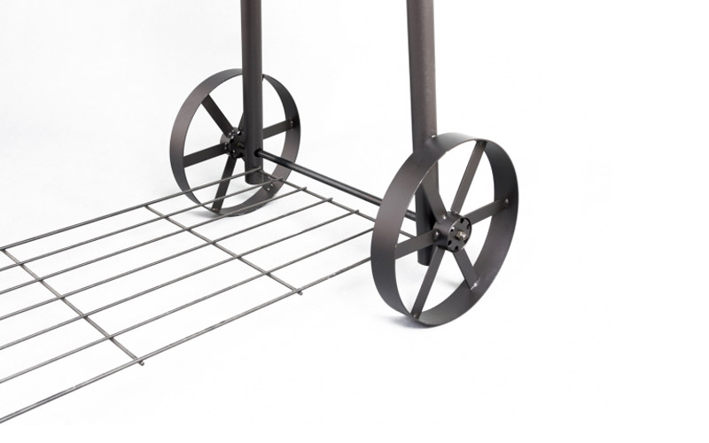 Gril je vyroben ze silného ocelového plechu o tloušťce 1 mm, který je ošetřen černým ohnivzdorným nátěrem. Díky dřevěné rukojeti a dvěma kolečkům můžete gril pohodlně přemístit.