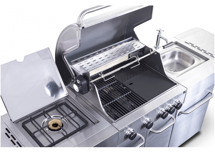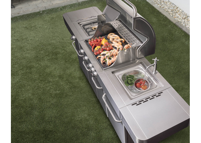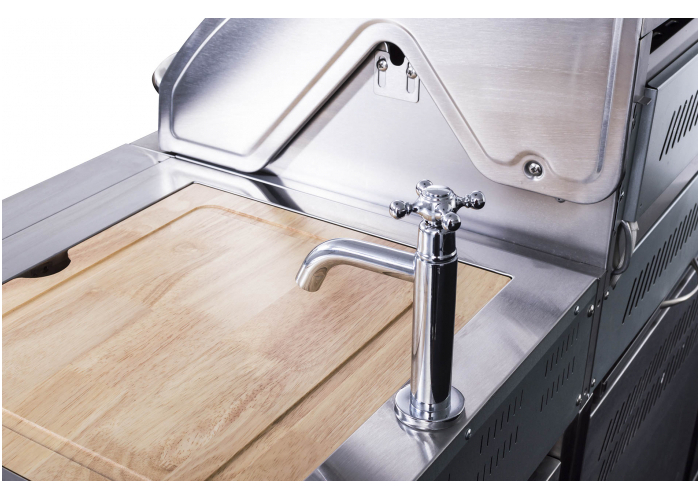 Gril navíc disponuje vestavěným dřezem, který má přívod na vodu ze zahradní hadice. Až nádobí opláchnete jednoduše stačí dřez zakrýt prkénkem a získáte tak větší pracovní plochu k přípravě pokrmů.