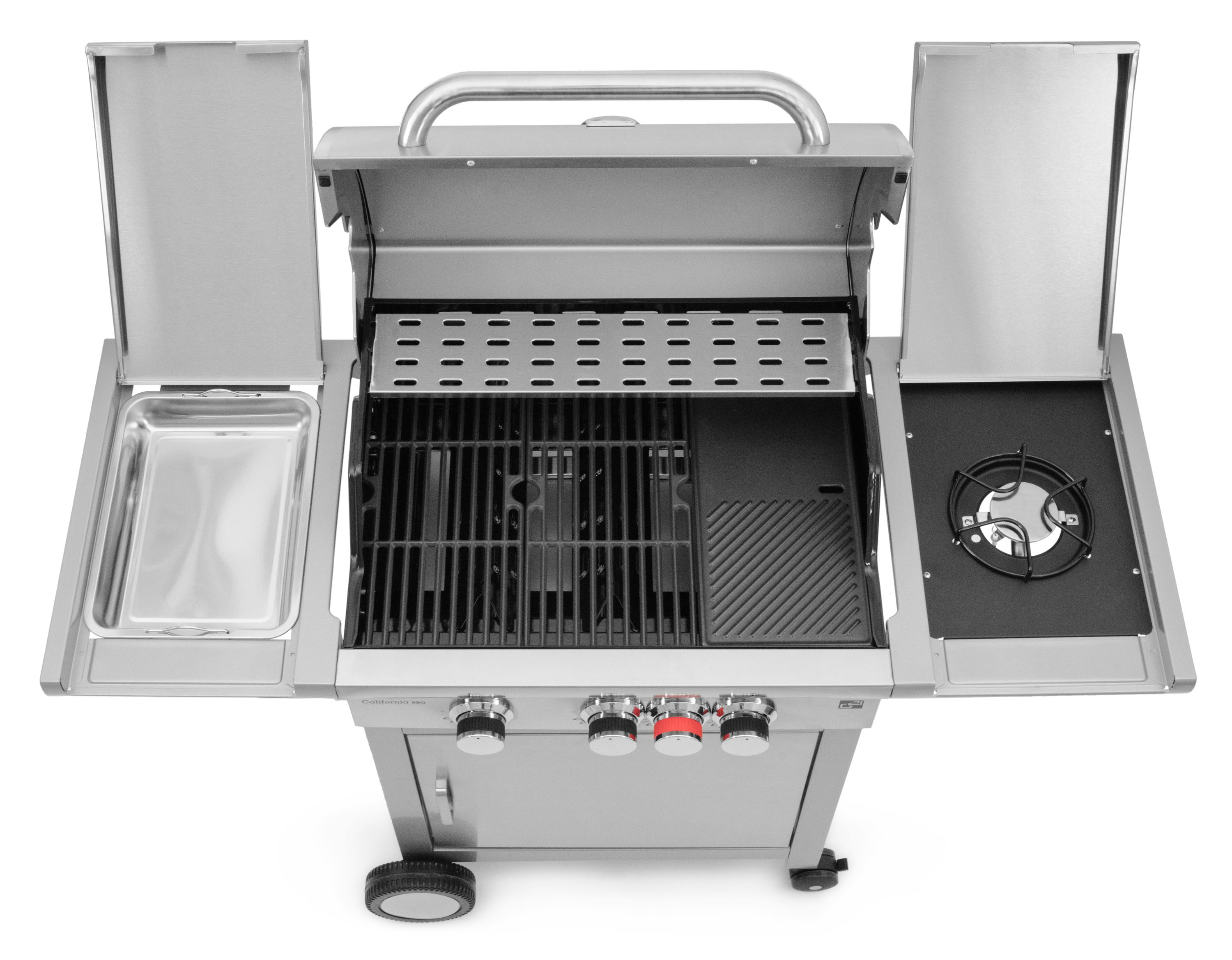 Gril disponuje třemi hlavními hořáky a jedním bočním, který můžete využít také jako vařič. Gril se zapaluje pomocí elektronického zapalování. Je vybavený litinovým roštem a litinovým plátem.