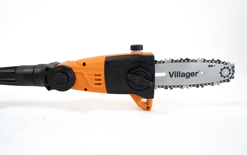 Lišta Villager o délce 24 cm s kvalitním řetězem umožňuje řezání větších větví, náletových dřevin nebo živých plotů. Automatické mazání řetězu snižuje tření a zvyšuje životnost řetězu. Antivibrační systém absorbuje vibrace motoru díky propracovanému systému pružin a práce je tak pohodlnější i bezpečnější. Pila je vybavena účinnou brzdou řetězu pro zajištění maximální bezpečnosti obsluhy. Velký ozubený kovový doraz zajišťuje bezpečné a pohodlné vedení při všech pracích.