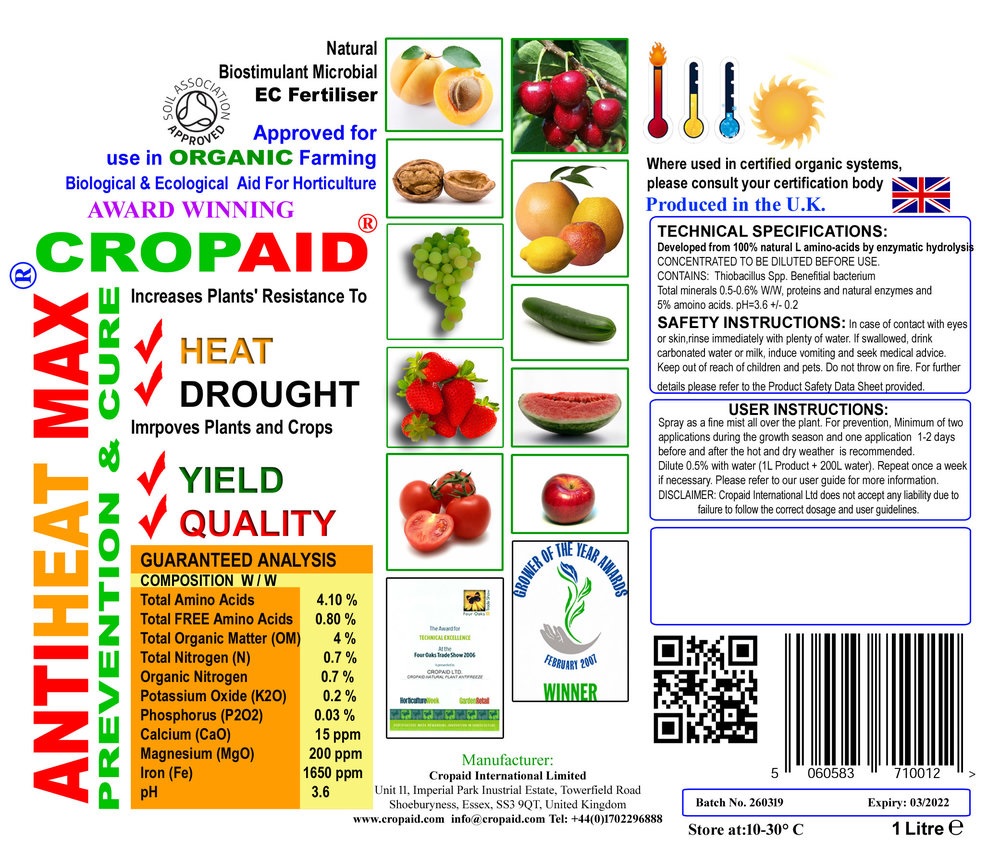 AntiHeat MAX® stimuluje a posiluje zlepšení vlastností rostlin prostřednictvím různých reakcí v metabolismu rostliny. Nejen, že zvyšuje odolnost rostlin vůči poškození teplem a suchem, ale také je léčí po skončení období stresu z horka a sucha. Průměrná trvanlivost aminokyselin "MAX" je 1 rok. Následně je stále možné přípravek používat s trvanlivostí 3 roky.