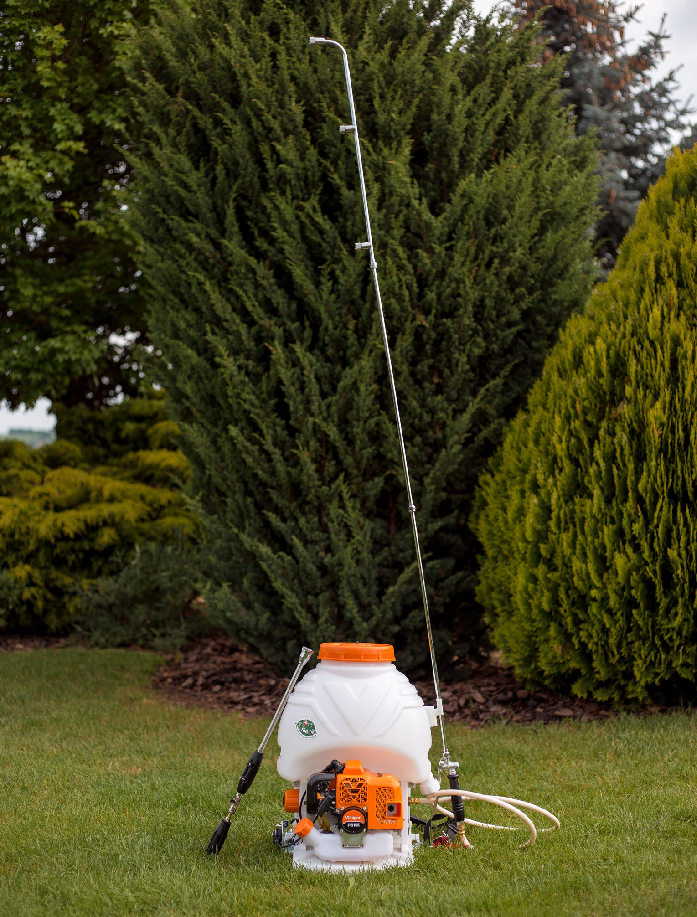 Zádový postřikovač je poháněn 2-taktním, vzduchem chlazeným spalovacím motorem o objemu 25,4 cm3 a výkonu 0,7 kW, který je spojený s dvoucestným pístovým čerpadlem přes zpomalovací převodovku. To vytváří velmi velký tlak a tím i vysokou výkonnost.