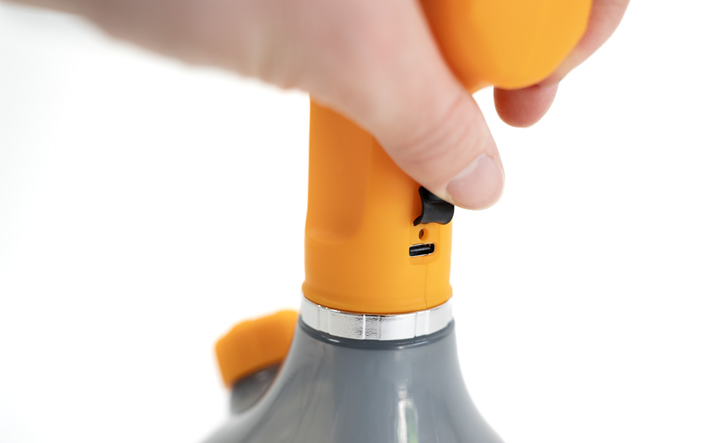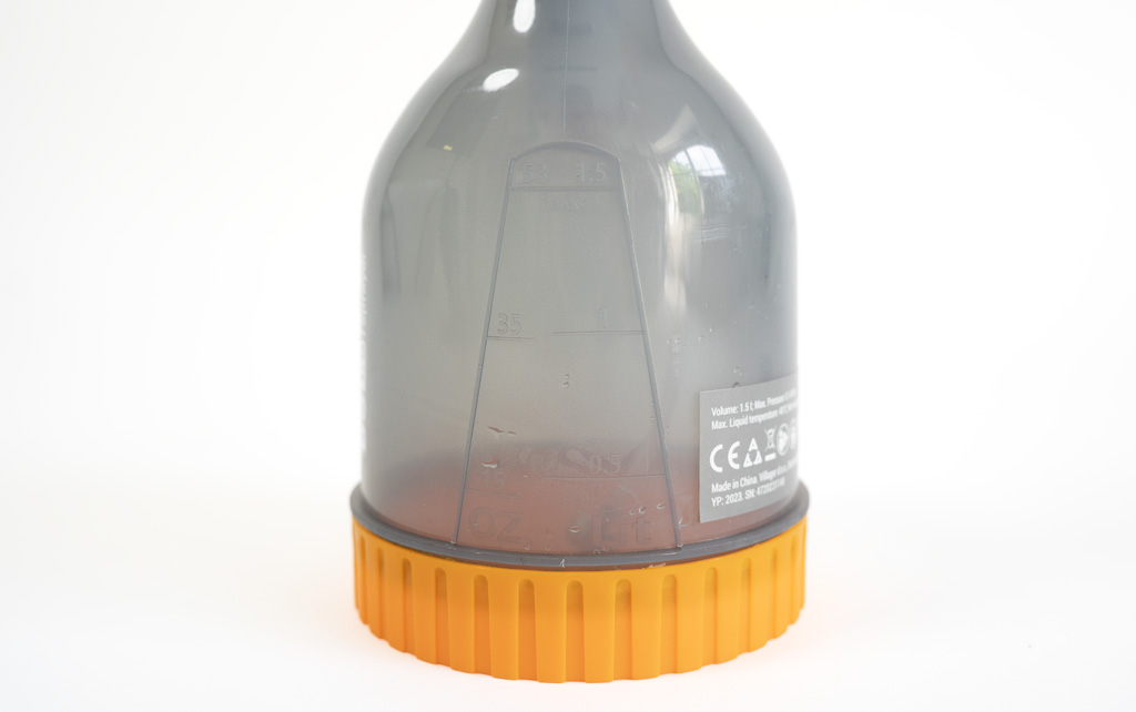Tlakový postřikovač pracuje s maximálním tlakem 1,4 bary. Kontrolu hladiny 1,5 litrové nádrže vidíte na boční měrce. Velkou výhodou postřikovače je nízká hmotnost 0,4 kg.