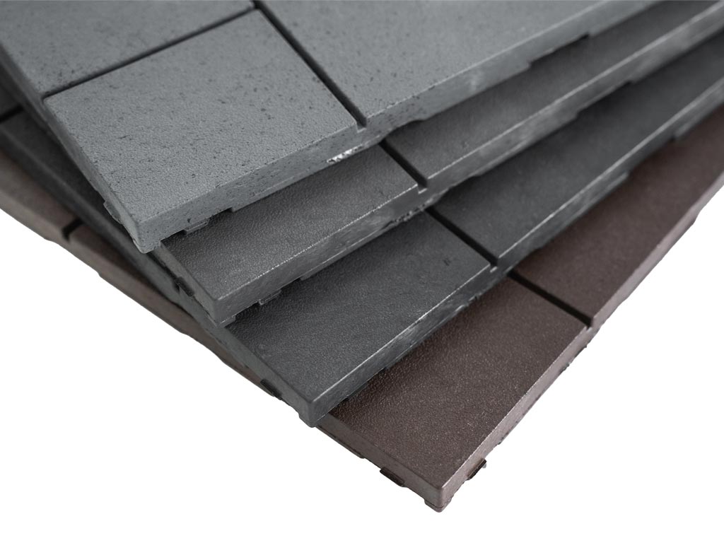 Všechny dlaždice Multy Home se vyrábí ze směsi recyklovaných pneumatik a recyklovaného polypropylenu.