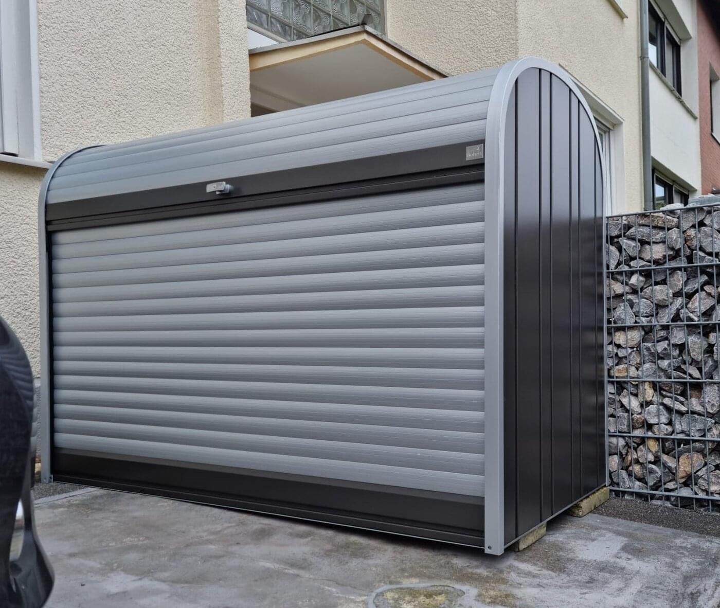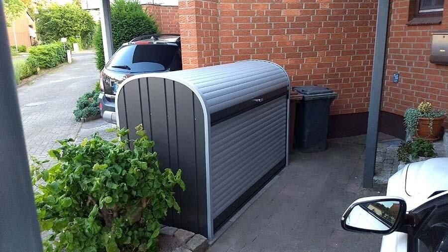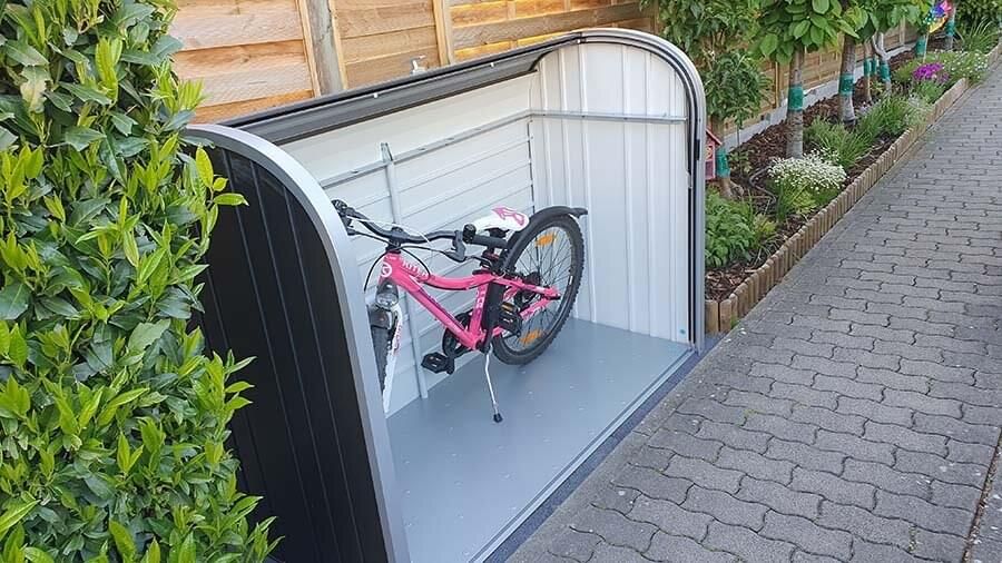Box je absolutně odolný proti dešti, s integrovanou ventilací, uzamykatelný. Dokoupením držáku jízdních kol v nabídce volitelného příslušenství získáte bezpečnou garáž pro svá kola.
