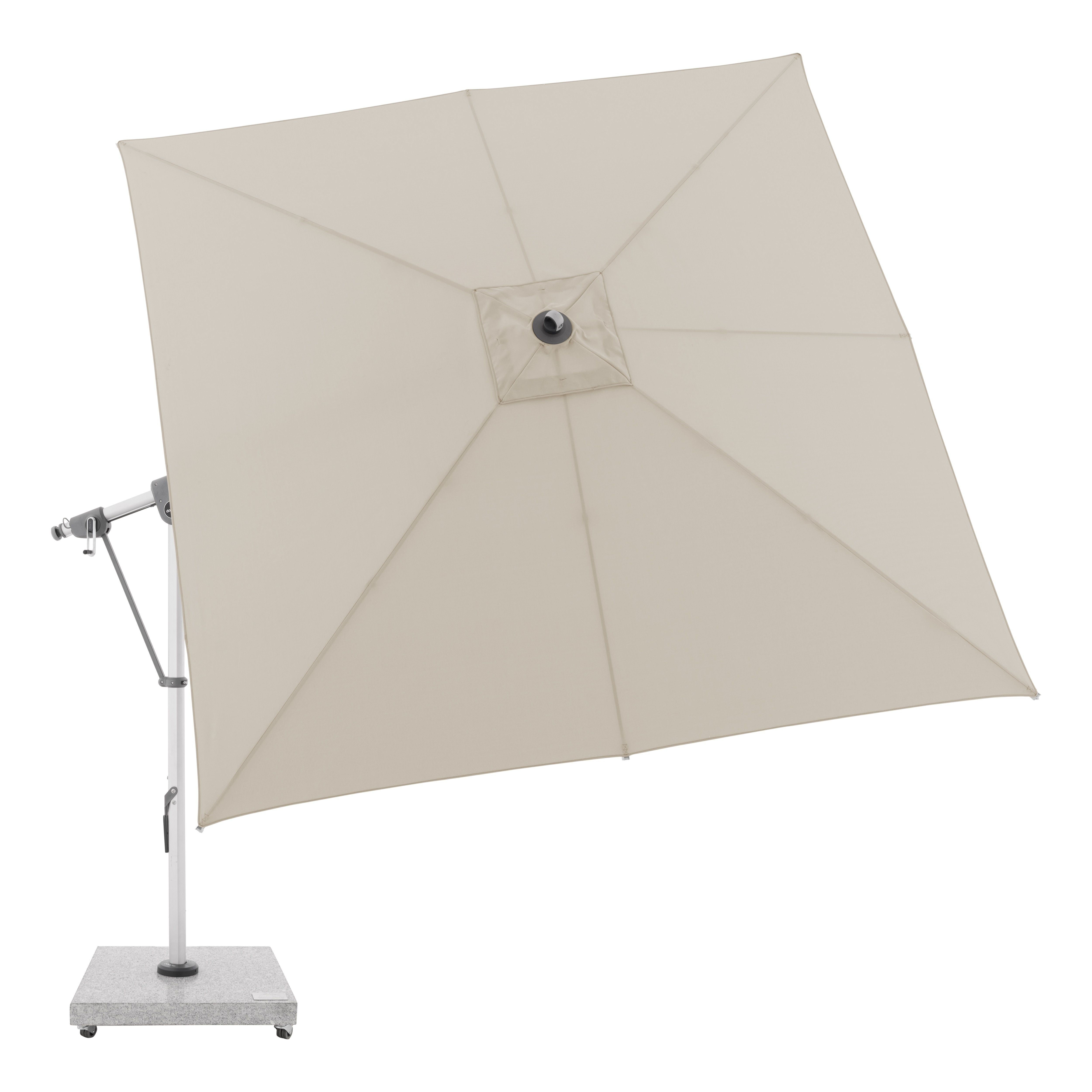 Tento multifunkční výkyvný slunečník s boční tyčí Doppler Expert 3 x 3 m lze optimálně přizpůsobit poloze slunce díky své schopnosti otáčení o 360° a oboustrannému bočnímu naklápění střechy. Konstrukce je vyrobena z vysoce jakostního hliníku a všechny díly jsou šroubované. Potah je vyroben z polyesterové tkaniny odpuzující vodu s dobrou UV ochranou 80+. Potah je snímatelný, s možností ručního praní. Vodoodpudivý potah je s impregnací proti špíně a plísni včetně ochranného obalu, který chrání slunečník před nepřízní počasí. Instalace na žulový sokl nebo zemní kotvu.