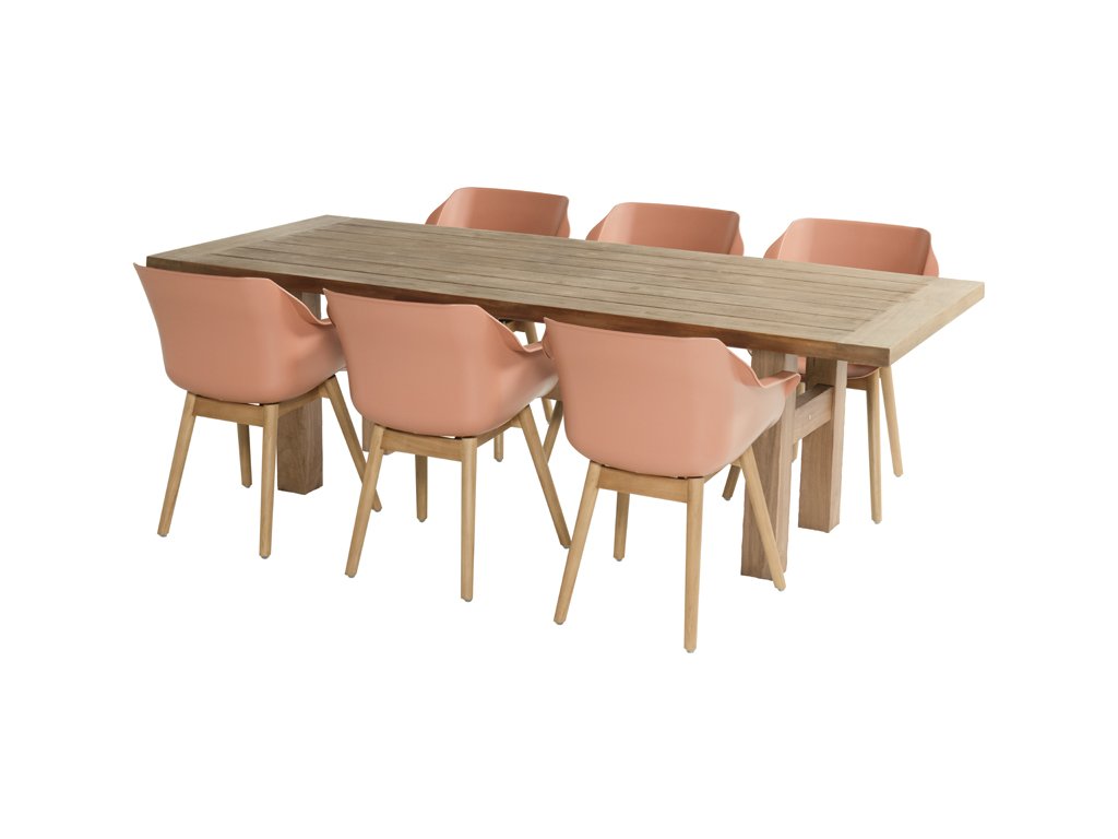 Stůl je vyroben z teakového dřeva a je neuvěřitelně bytelný a odolný. Teak má lehce našedlou barvou, která je pro něj přirozená a v průběhu času ještě lehce zesvětlá. Pokud chcete udržet stejnou barvu dřeva, můžete stůl ošetřit nátěrem. Tento materiály je také velmi odolný vůči různým povětrnostním vlivům a nepřízni počasí. Díky tomu může stůl zůstat venku po celý rok.