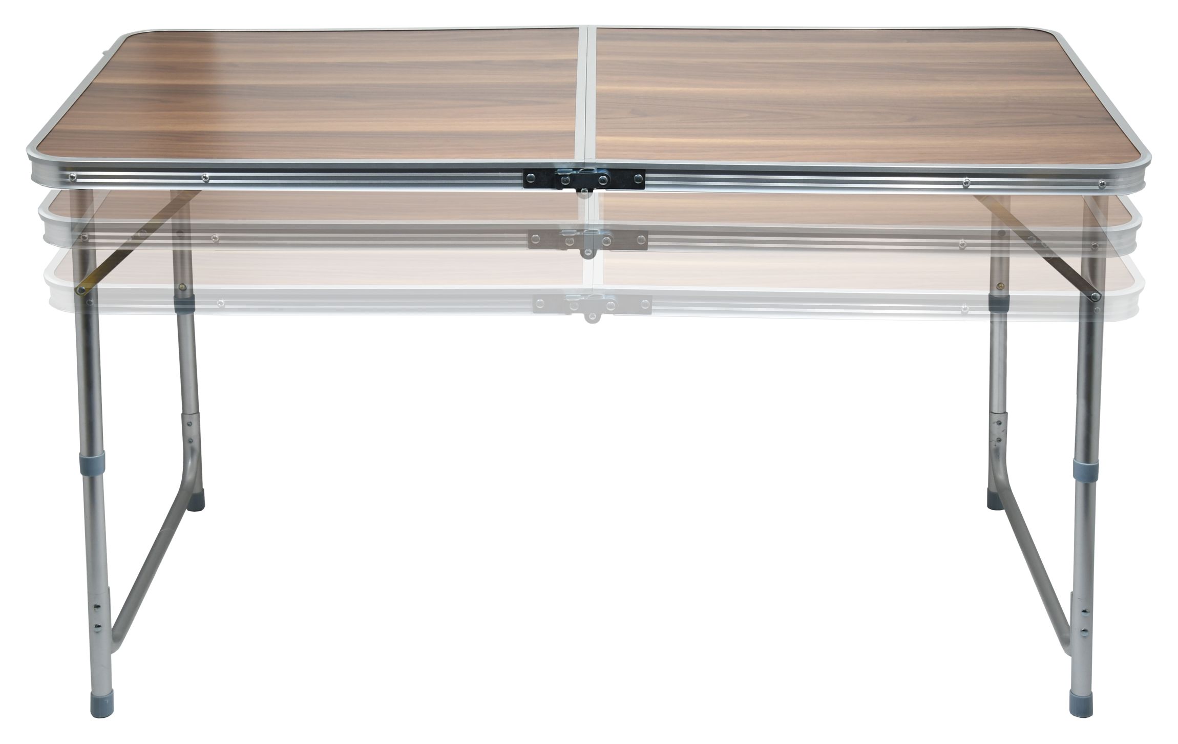 Stůl Double je skládací, teleskopický stůl zhliníkové konstrukce, s rovnou plochou a vzorem kvalitně imitujícím dřevo.