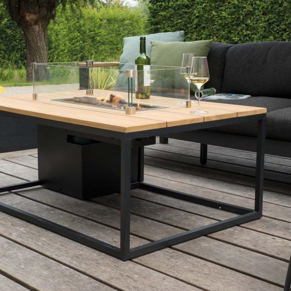 Elegantní robustní stůl s plynovým ohništěm COSI Cosiloft 120 v kombinaci černý rám / deska přírodní teak o rozměru 120 x 80 x 48 cm je skvělým doplňkem, díky kterému získáte ještě větší potěšení ze své zahrady, balkonu nebo terasy. Krásně vyhřeje a zútulní verandu nebo zimní zahradu. Stůl s ohništěm lze umístit venku nebo na dobře větraných místech, které jsou součástí interiéru.