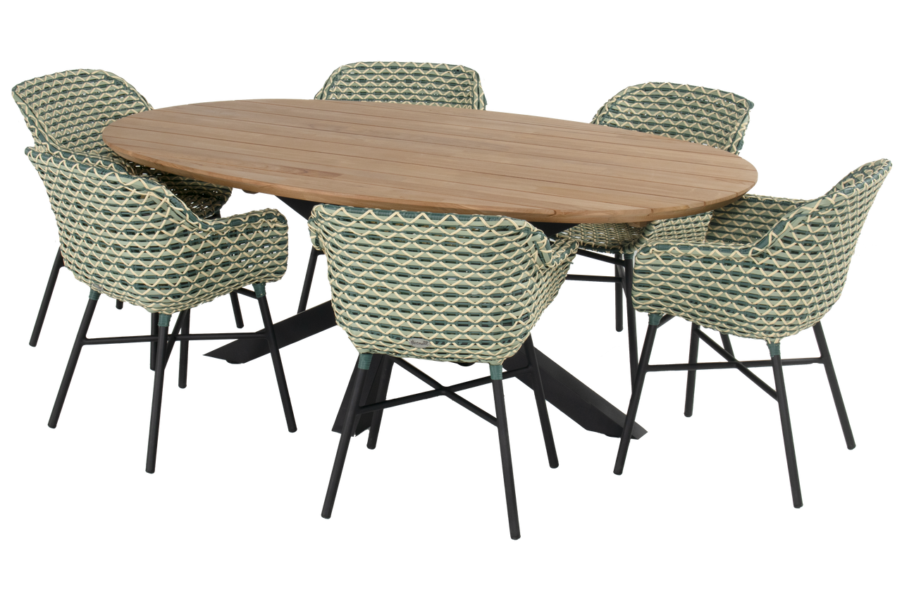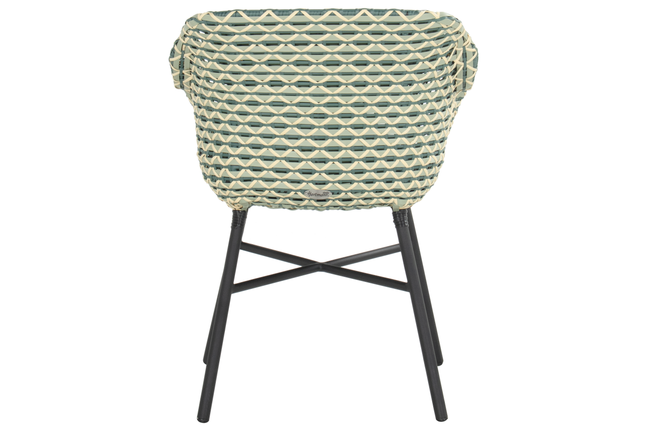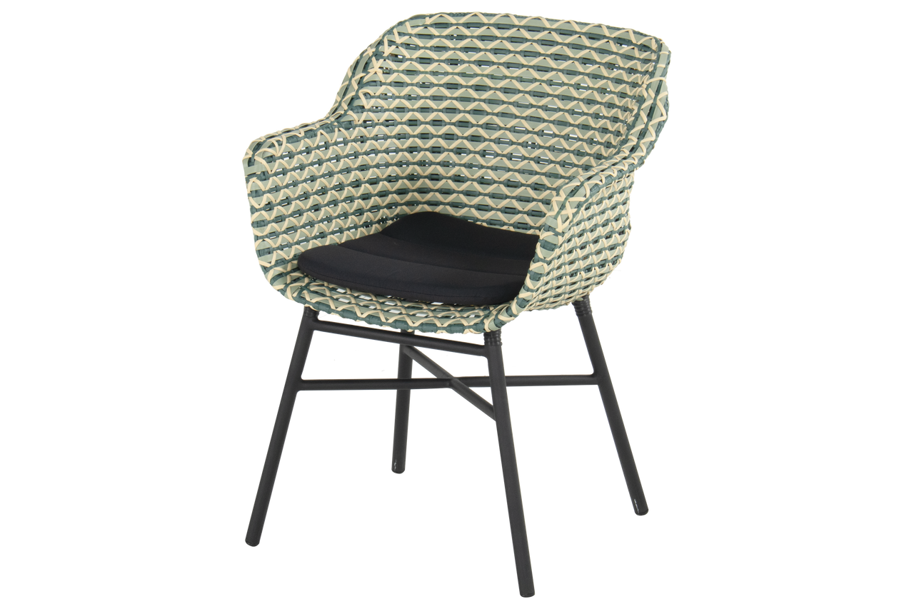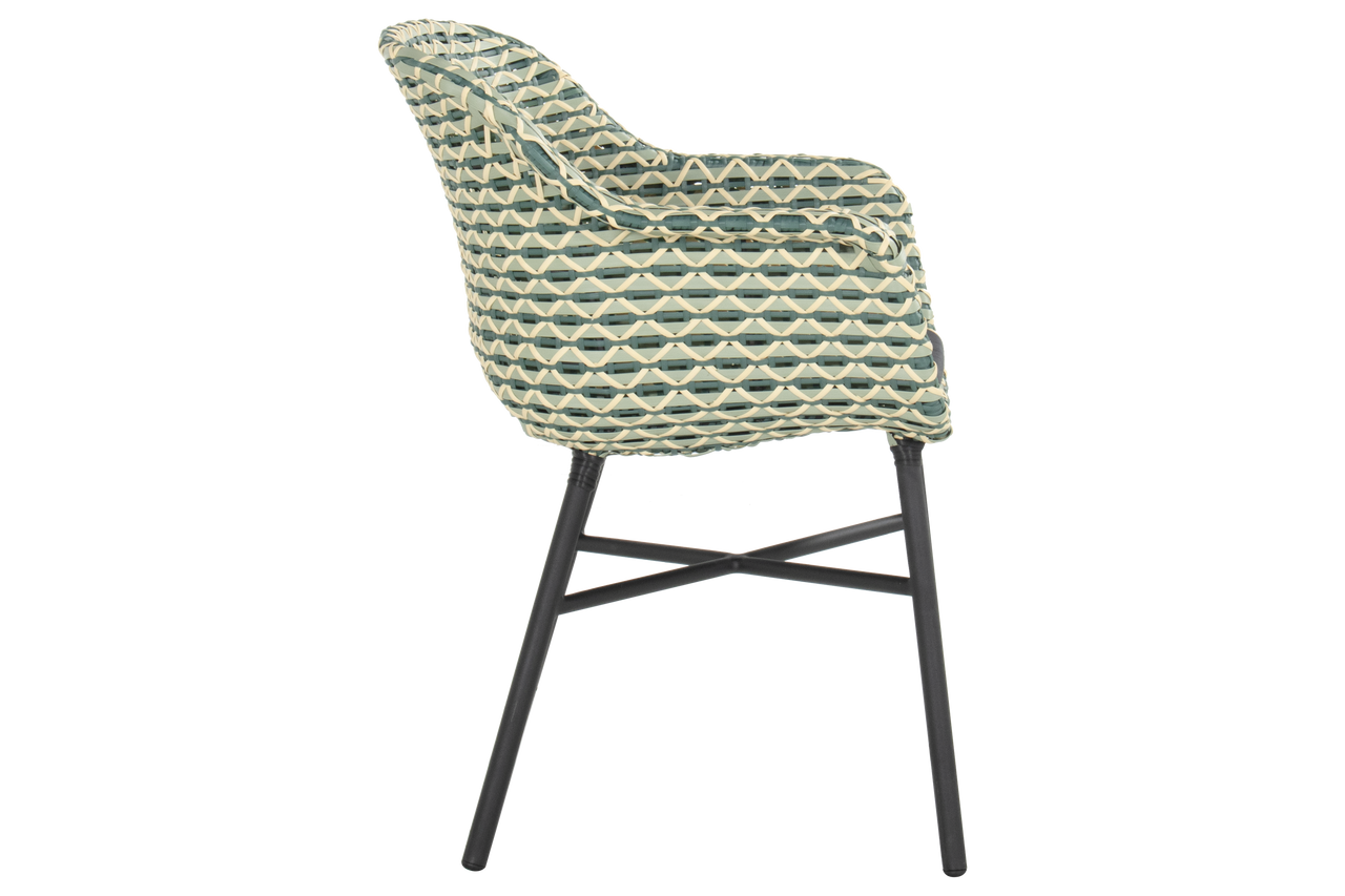 S tímto zahradním křeslem z kolekce DELPHINE získáte maximální oporu pro vaše záda, abyste mohli dlouho a pohodlně sedět. Je vyrobeno z hliníkové kostry v černé barvě a z umělého ratanu v zelenobílém provedení. Pruty jsou elegantně spleteny a působí velice luxusně a jedinečně. Křeslo můžete nechat venku po celý rok a čištění je super snadné.