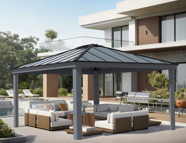 Luxusní zahradní hliníkový altán od značky PALRAM Dallas 14 x 20 je ideální volbou pro ty, kteří hledají elegantní a prostorný přístřešek pro relaxaci, posezení s rodinou nebo přáteli. Altán je perfektním zastřešením venkovního posezení, grilu nebo venkovní vířivky. Hliníková konstrukce je v barvě antracitu. Masivní konstrukce z hliníkových profilů je navíc odolná vůči korozi, což znamená, že se nemusíte starat o natírání, hnilobu, mech nebo dřevokazné hmyzy, jak tomu bývá u dřevěných konstrukcí.