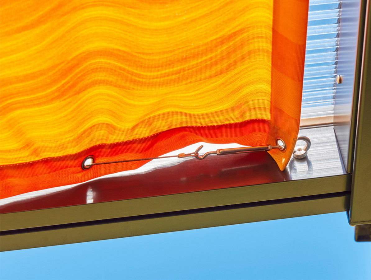 Jeden pruh látky s šířkou 94,5 cm pokrývá jeden polykarbonátový panel.