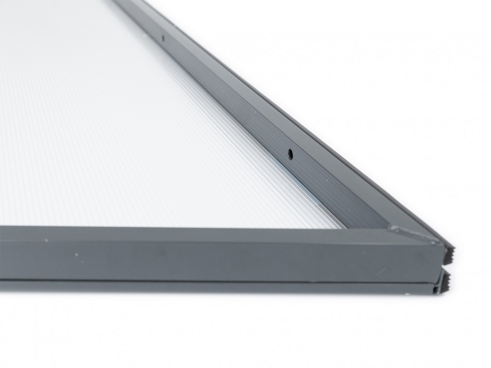 Boční stěna je vyrobená z práškově lakovaného hliníku antracitové barvy RAL 7016. Hliníková konstrukce perfektně odolává vlivům počasí, i po letech je pevná a stabilní. V zimě mrazem nekřehne a ani na silném letním slunci nedochází ke změnám barvy. Stěna je zasklená bronzovým komůrkovým polykarbonátem síly 6 mm s oboustranným UV filtrem.