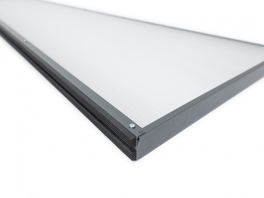 Boční stěna je vyrobená z práškově lakovaného hliníku antracitové barvy RAL 7016. Hliníková konstrukce perfektně odolává vlivům počasí, i po letech je pevná a stabilní. V zimě mrazem nekřehne a ani na silném letním slunci nedochází ke změnám barvy. Stěna je zasklená čirým komůrkovým polykarbonátem síly 6 mm s oboustranným UV filtrem.