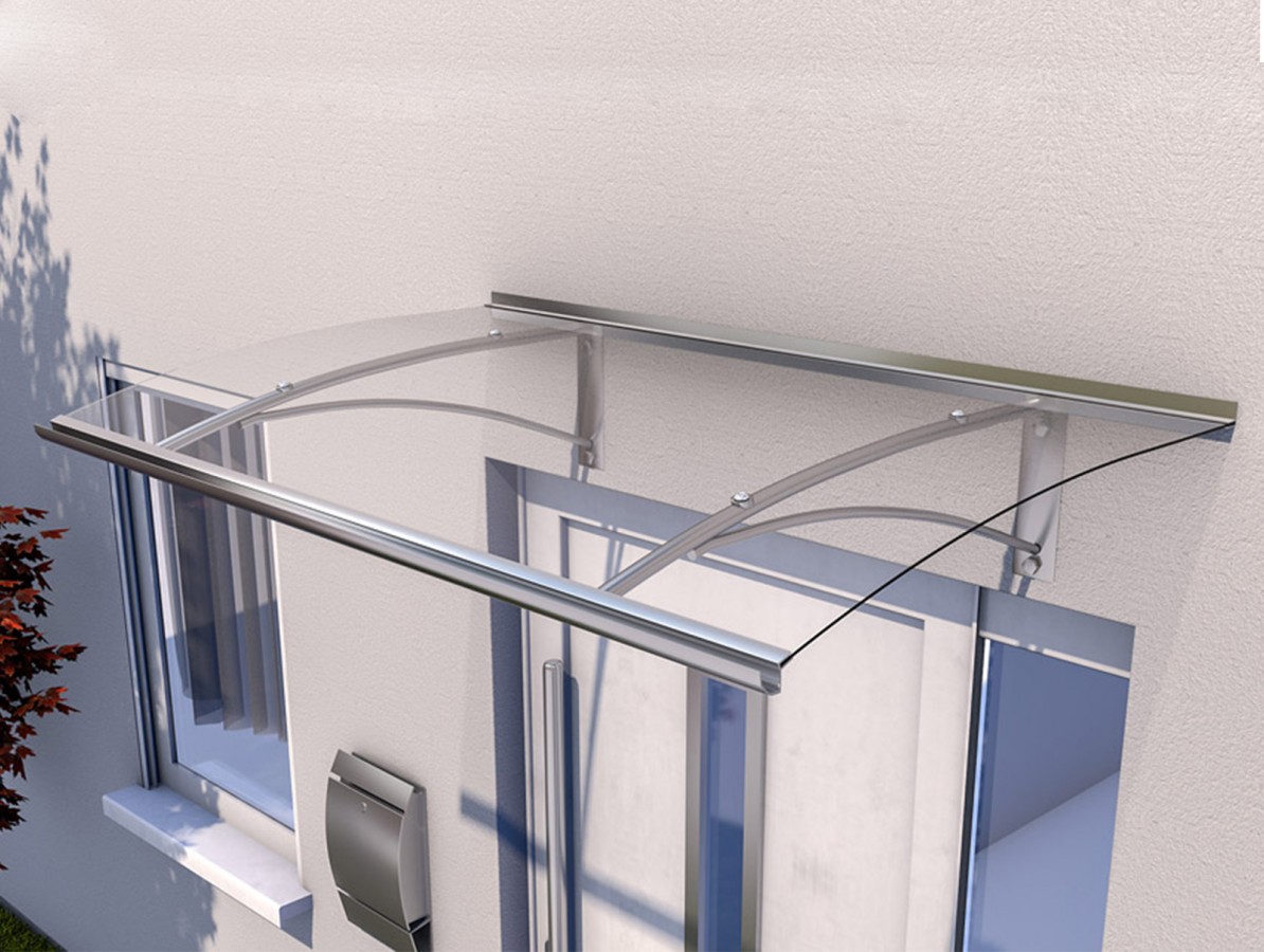Stříšku nabízíme v rozměrech – šířka 160 cm × hloubka 90 cm × výška oblouku 27 cm a barevné kombinaci – stříbrné profily + zasklení čirým plným polykarbonátem 4 mm.