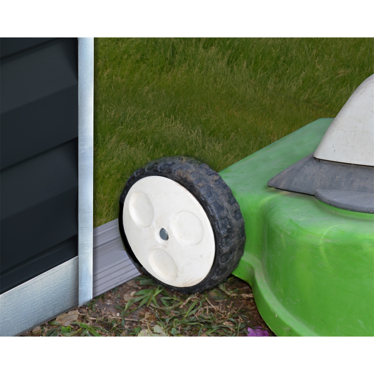 Dveře jsou zamykatelné, s hliníkovým rámem a sníženým prahem, což umožňuje snadný přístup i manipulaci s kolečkem nebo travní sekačkou. Protiskluzová podlaha, která je součástí dodávky, chrání uložené věci před vlhkostí a zajišťuje bezpečný pohyb uvnitř domku.