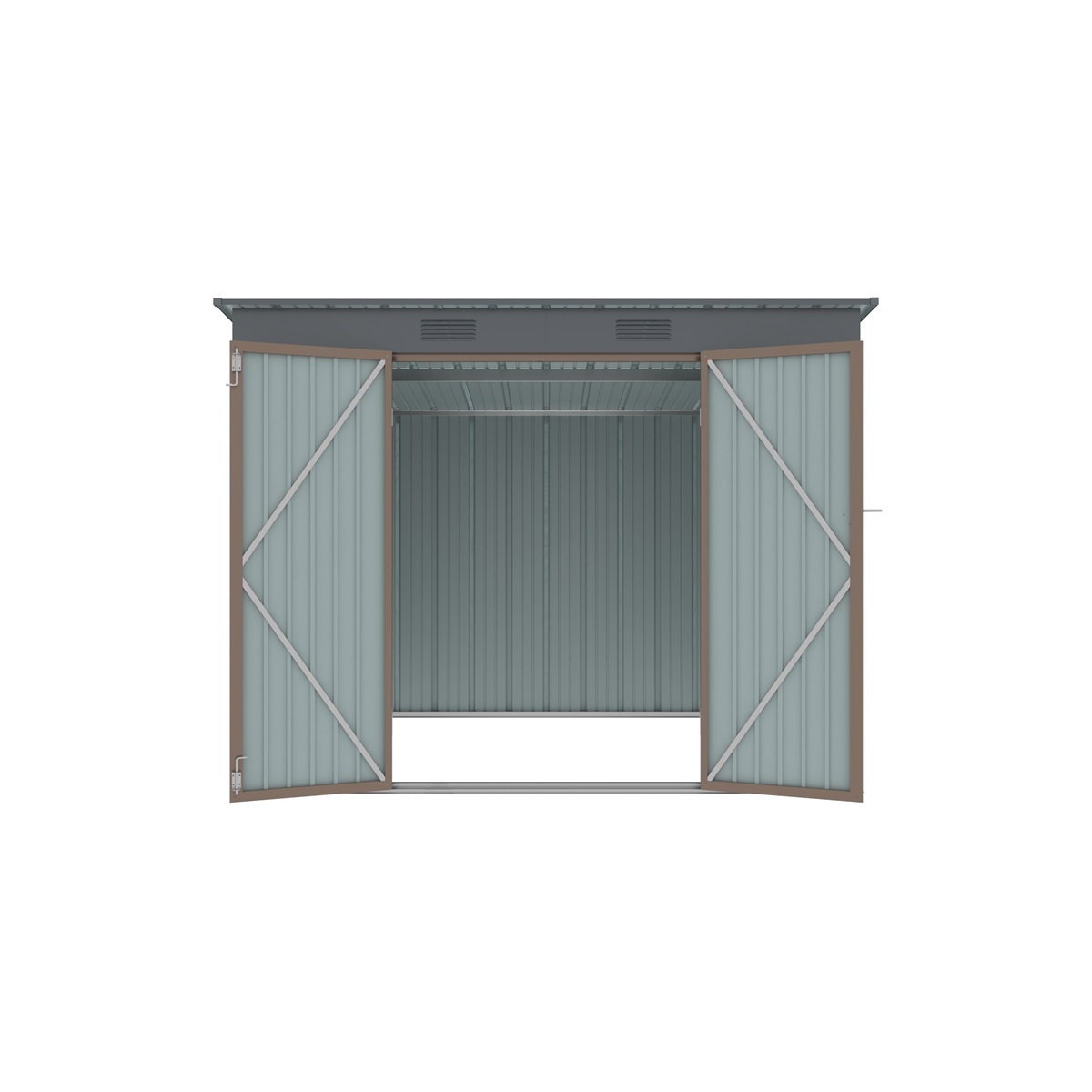 Pultová střecha domku je nejen estetická, ale také praktická – její sklon umožňuje efektivní odvod vody a sněhu, čímž minimalizuje zatížení konstrukce. Dva integrované větrací otvory zajišťují optimální cirkulaci vzduchu a chrání uložené předměty před vlhkostí a kondenzací.