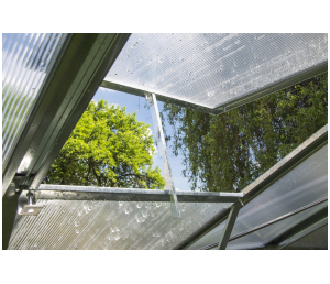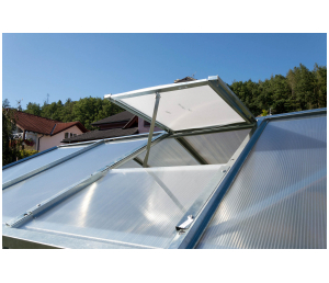 I přesto, že skleník od výroby disponuje vyklápěcím oknem, pro správné proudění vzduchu v parných dnech je nutné zajistit také střešní ventilaci pro odvod teplého vzduchu. Otevírání střešního okna lze zautomatizovat přidáním střešního automatického otvírače, který se otevírá a zavírá dle okolní teploty.