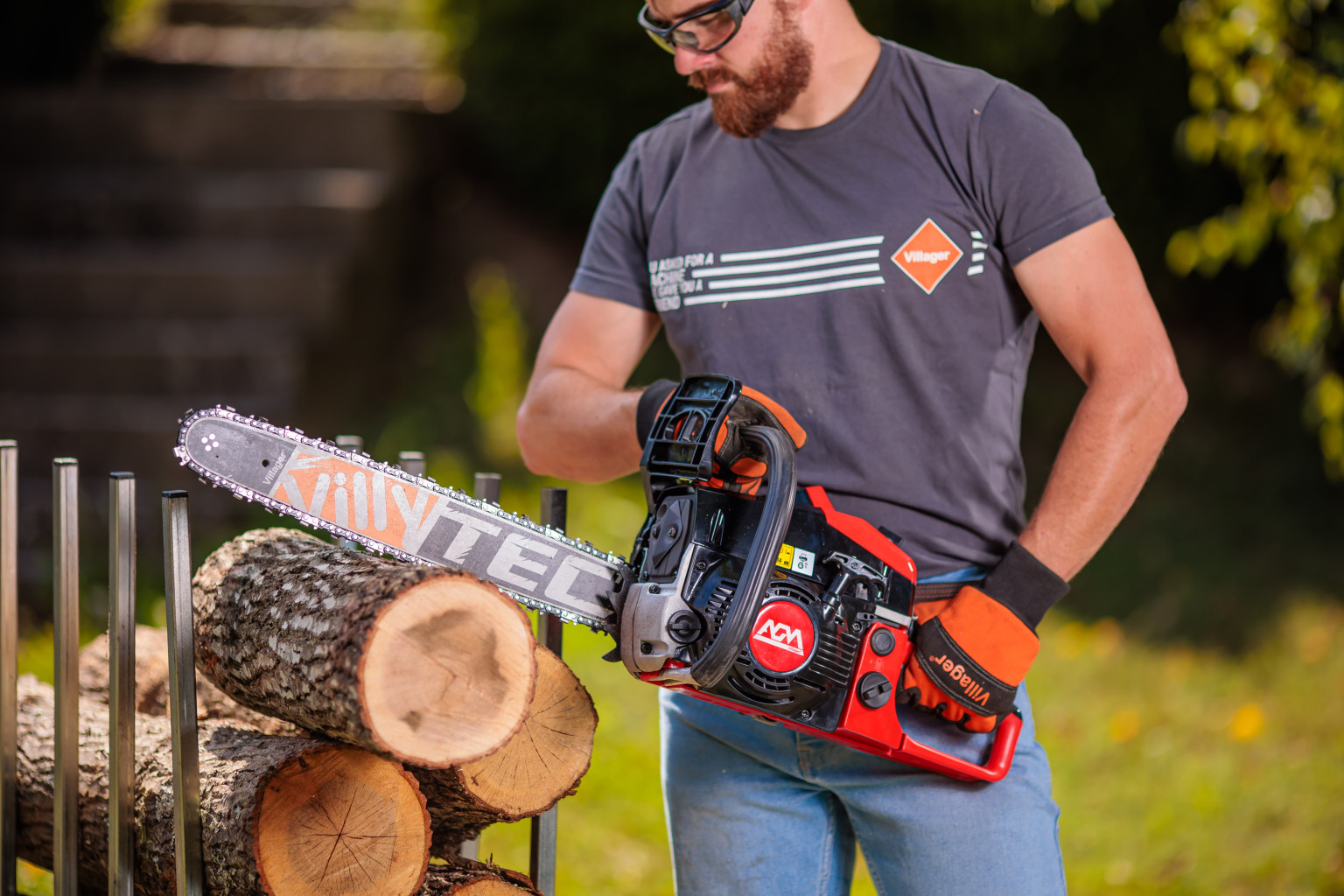 Lišta Villager o délce 45 cm s kvalitním řetězem umožňuje řezání větších kmenů, prořezávání lesního porostu, nebo přípravu palivového dřeva na topnou sezónu. Automatické mazání řetězu snižuje tření a zvyšuje životnost řetězu. Pila je vybavena účinnou brzdou řetězu pro zajištění maximální bezpečnosti obsluhy. Velký ozubený kovový doraz zajišťuje bezpečné a pohodlné vedení při všech pracích.