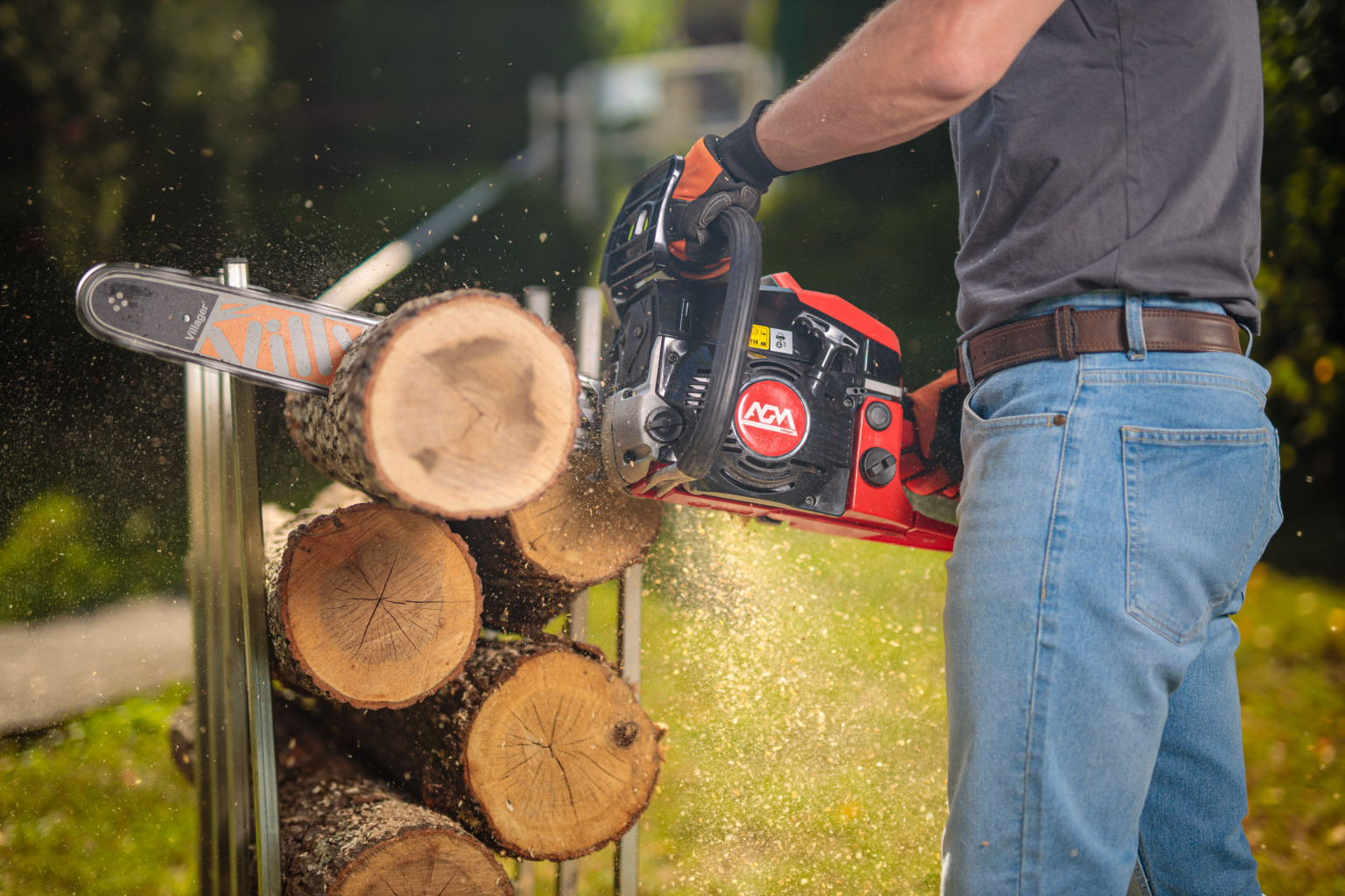 Vzduchem chlazený dvoutaktní motor o zdvihovém objemu 45,8 cm³ a výkonu 1,8 kW si poradí dokonce i s nepoddajným dřevem: Větve, hranoly a palivové dříví proti benzínové řetězové pile nic nezmůžou.