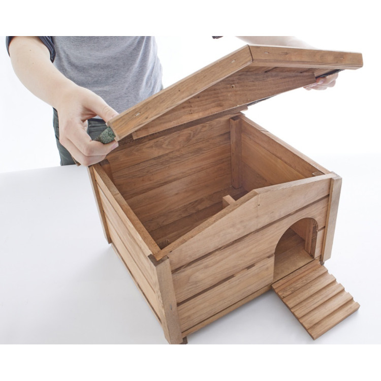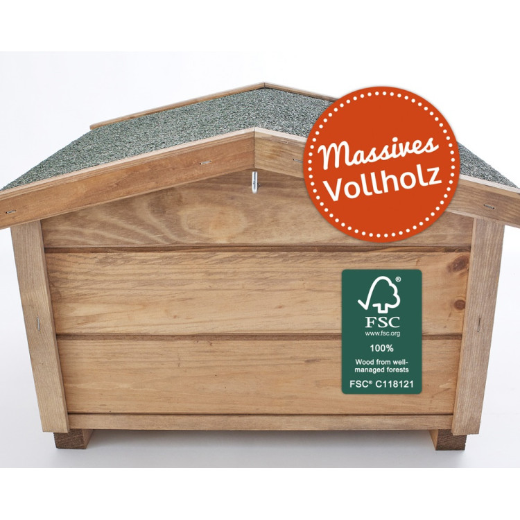 Konstrukce z vysoce kvalitního masivního dřeva je ošetřena netoxickou glazurou, která je šetrná k přírodě i samotnému obyvateli domku. Šikmá střecha s zelenou bitumenovou membránou zajišťuje, že vnitřek zůstane suchý i během prudkých dešťů nebo sněhové nadílky. Střechu lze navíc pevně přišroubovat, čímž zabráníte jejímu nechtěnému odsunutí nepřáteli. Domek je připraven sloužit od listopadu pro zimní spánek i v letním období jako útočiště pro matky s mláďaty.