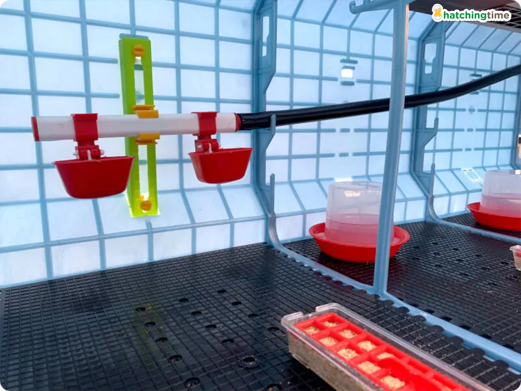 Systém je navržen pro minimální nároky na obsluhu. Voda je přiváděna z centrálního 20litrového průhledného zásobníku pomocí hadic do výškově nastavitelných niplových napáječek s miskami, které udržují podlahu suchou. Pro první dny jsou k dispozici i kloboukové napáječky. Velkokapacitní krmítka pojmou zásobu potravy až na 2 dny a jsou vybavena speciální mřížkou, která zabraňuje kuřatům v rozhrabávání a znečišťování krmiva.