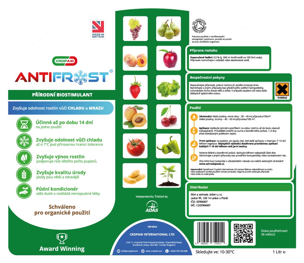 CROPAID Antifrost je vysoce účinný biostimulant, který obsahuje přírodní složky, jež pomáhají rostlinám odolávat stresu způsobenému nízkými teplotami. Tento produkt je navržen tak, aby podpořil přirozené mechanismy rostlin, které se brání chladu a mrazu, čímž zajišťuje jejich zdraví a vitalitu.