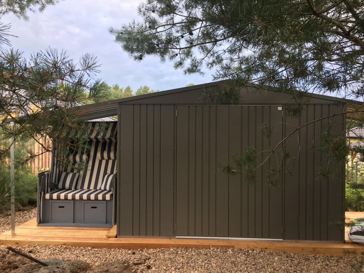Zahradní přístřešek Europa má jednoduchou sedlovou střechu, ke které může být připojená volitelná postranní střecha. Tuto lze připevnit na straně s okapem buď vpravo, vlevo nebo oboustranně. Vytvoříte si tak další krytý prostor. (Nelze dodat pro velikost 1 a velikost 2A.) Přesah střechy poskytuje ochranu před deštěm.