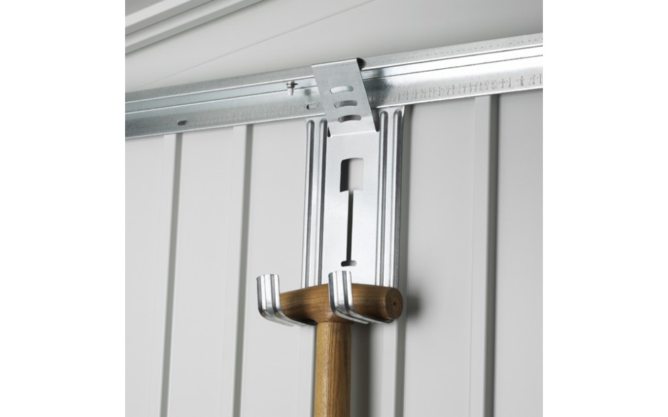 Držáky z žárově pozinkovaného ocelového plechu. Nosnost cca 10 kg. Ideální k zavěšení lopat, pilky, hrábí, zahradních hadic a dalšího zahradního nářadí. Snadná instalace, jednoduše zacvakněte na vybrané místo.