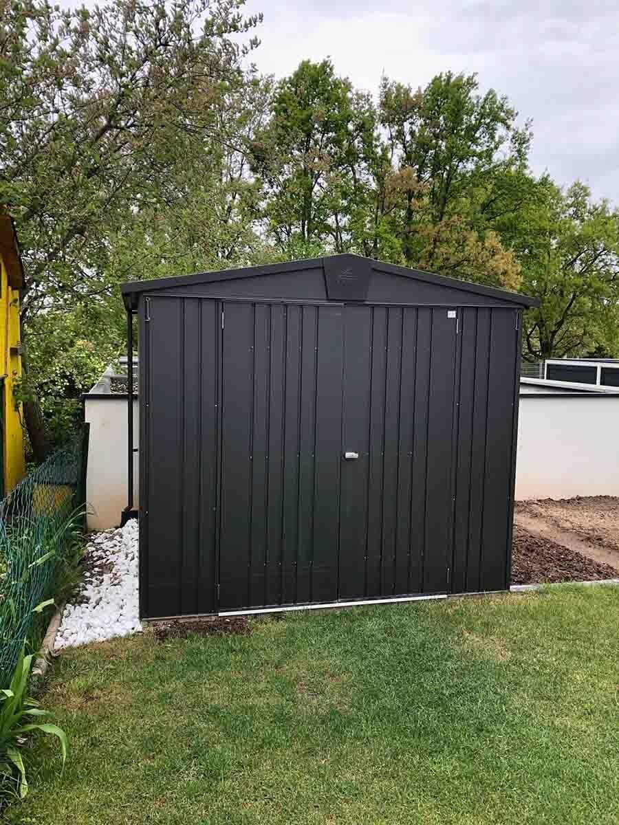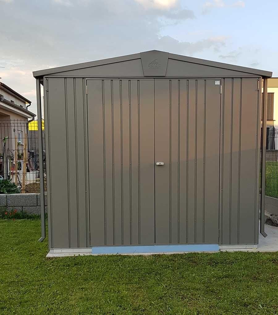 Nemáte kam uskladnit jízdní kola, potřeby k bazénu, zahradní sekačku s nářadím a další věci, které se nevejdou do domu, ale chcete je mít pod střechou a bezpečně pod zámkem? Pořiďte si stylový kovový domek na nářadí Europa 3 prémiové kvality se sedlovou střechou, který vyhovuje i nárokům moderní architektury. Domek je široký 244 cm (přední strana s dveřmi) a 156 cm dlouhý (včetně přesahu střechy). Domky Europa nabízíme ve čtyřech barevných provedeních a devíti velikostech.