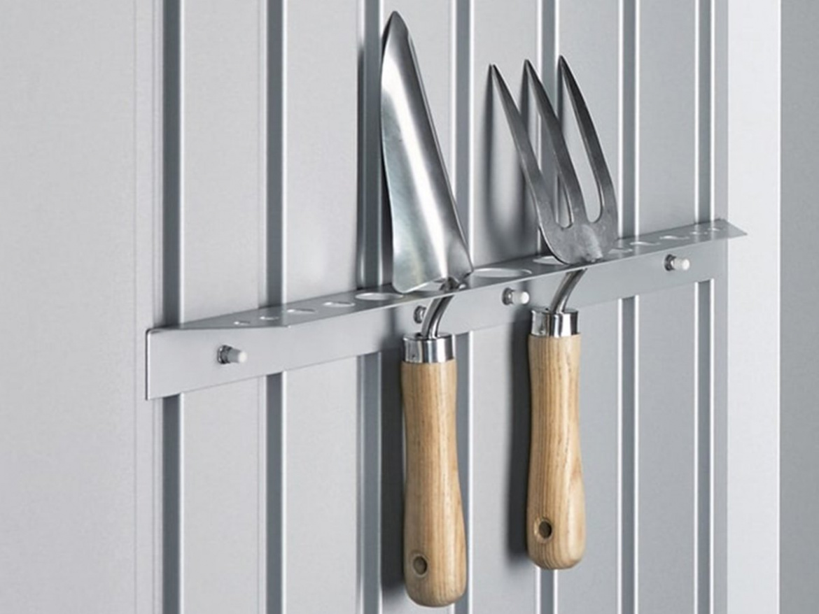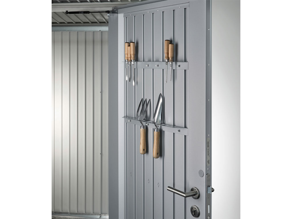 Držák na nářadí HPA slouží k systematickému uskladnění nářadí pro zahradní domek Highline, Panorama a AvantGarde. Balení obsahuje 2 držáky nástrojů včetně upevňovacího materiálu. Umisťuje se na vnitřní stranu dveří, kdy lze instalovat na jedno dveřní křídlo až 5 držáků najednou.