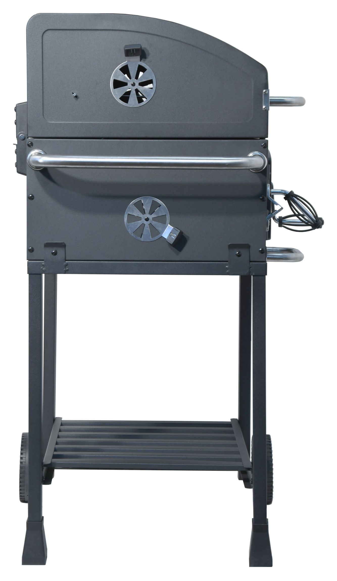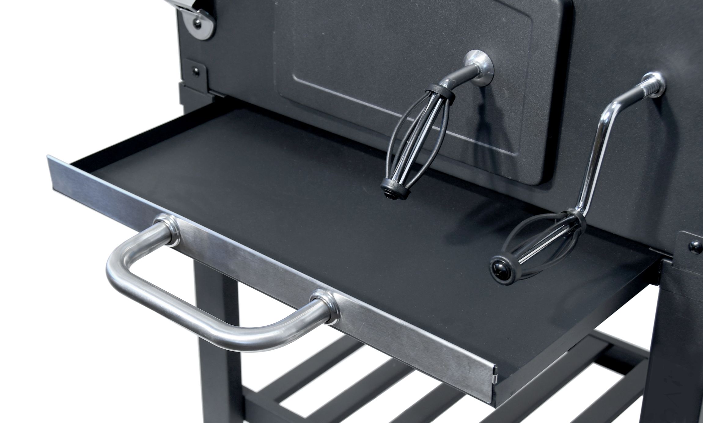Konstrukce z oceli je opatřena hrubou černou barvou. Madla a ovládací kovové prvky, mají dostatečné rozměry pro pohodlný úchop a zajišťují precizní ovládání. Oboustranná regulace ventilace perfektně lícuje s konstrukcí. Další předností je rošt na uhlí s nastavitelnou výškou 9-21 cm od grilovacího prostoru, pomocí kličky na přední straně. Dvířka na čelní straně grilu usnadňují doplňování uhlí.