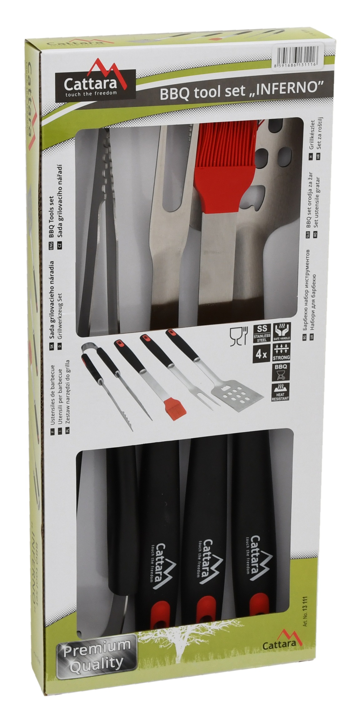 Grilovací sada Inferno od Cattary – perfektní pomocník pro vaše grilovací dobrodružství. Sada obsahuje obracečku, vidličku, kleště a mašlovačku, které vám usnadní přípravu a podávání pokrmů.